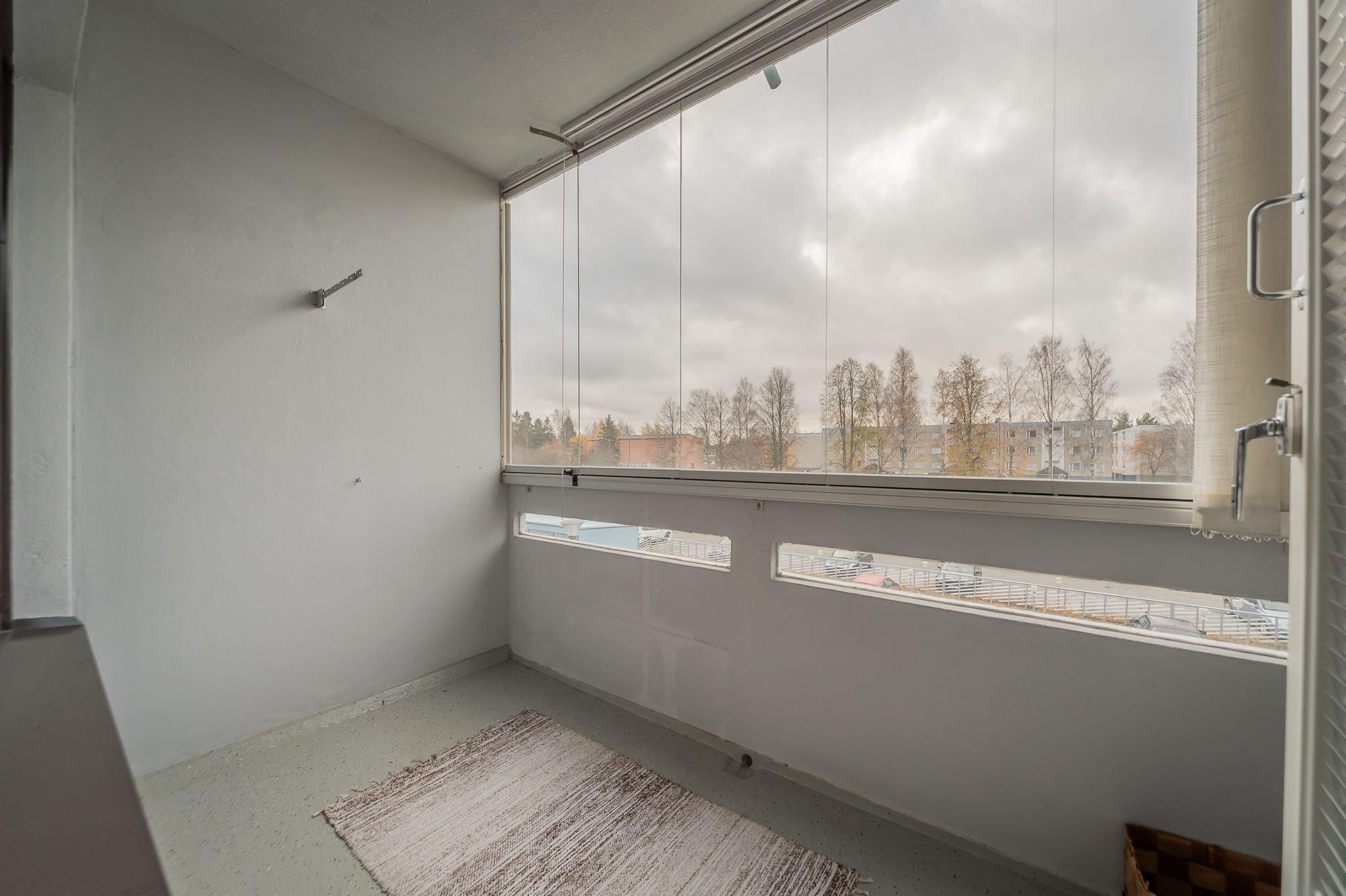 Tilavasta olohuoneesta pääsee pujahtamaan etelänsuuntaiselle lasitetulle parvekkeelle, jossa liialta paisteelta suojaa lamelliverhot.