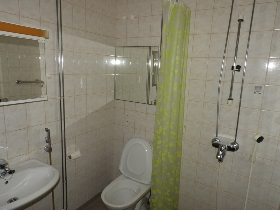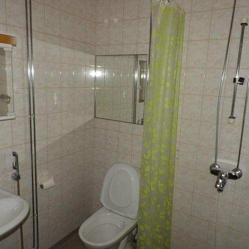 Varusteet: lattiaan asennettu WC, bidee, peilikaappi