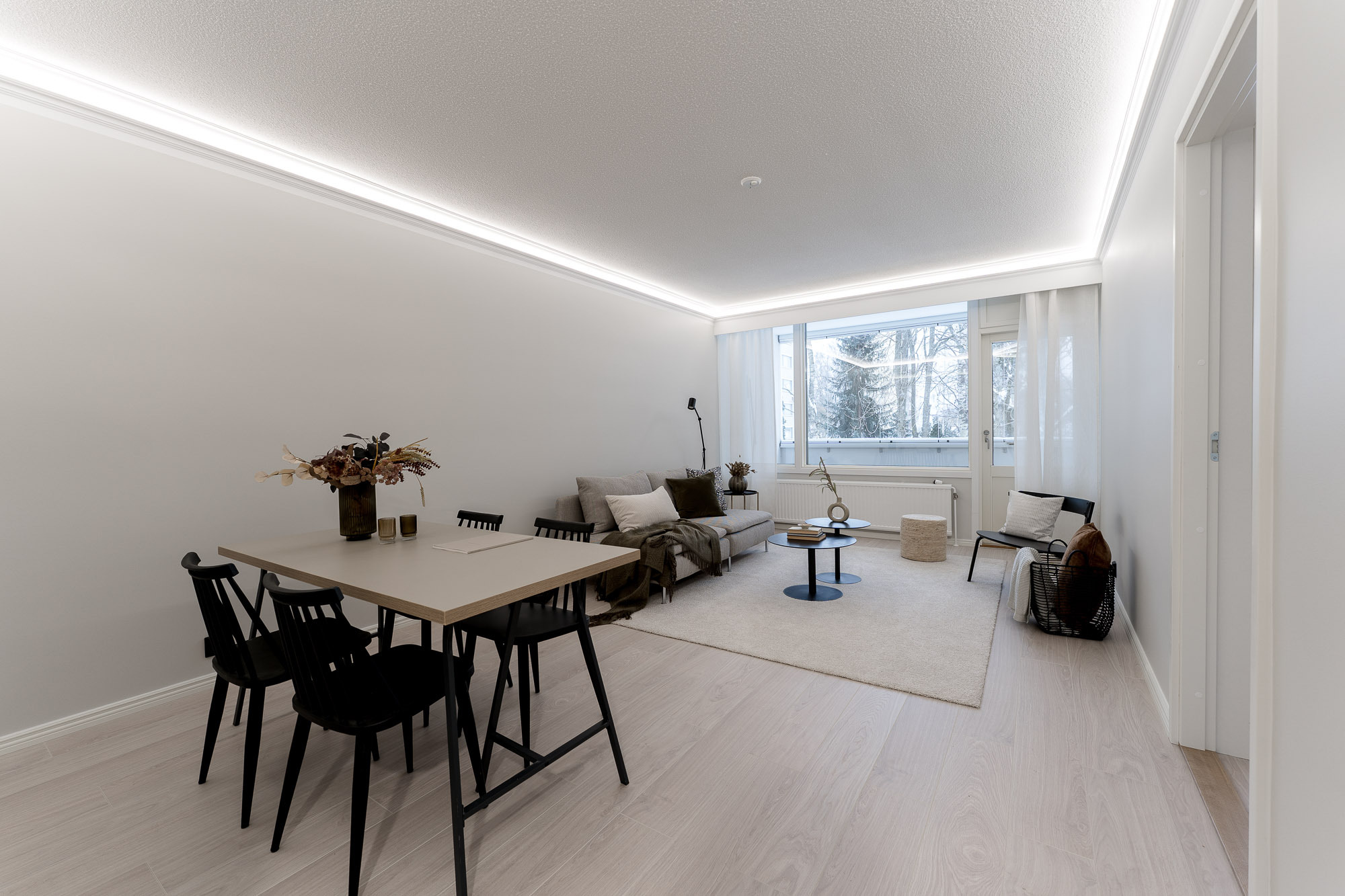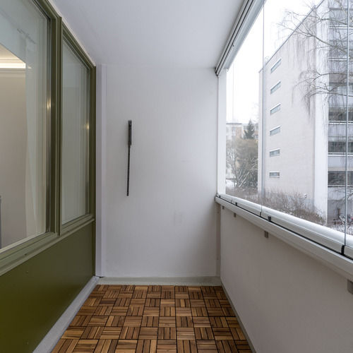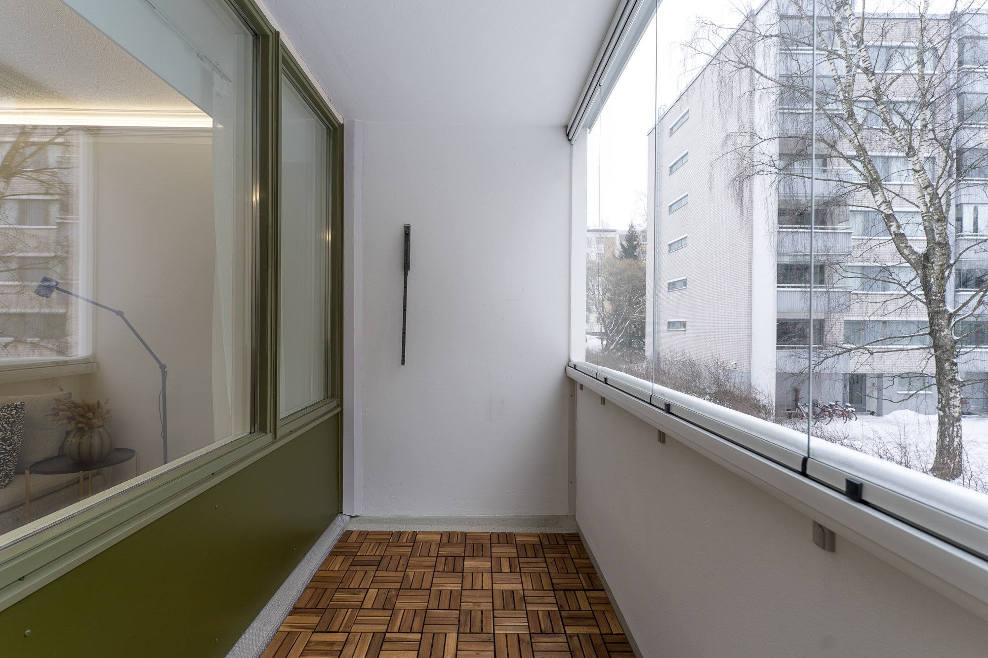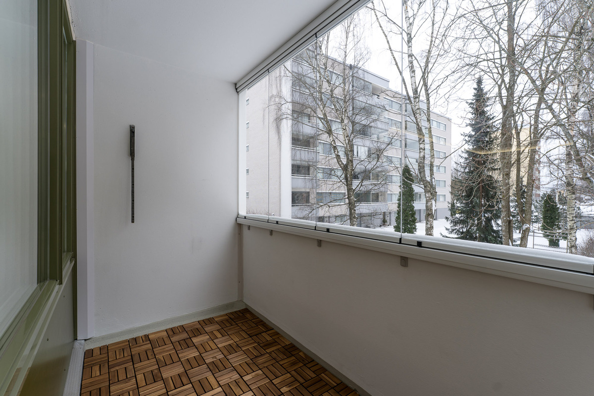 Olohuoneesta käynti lasitetulle parvekkeelle, josta vehreät näkymät