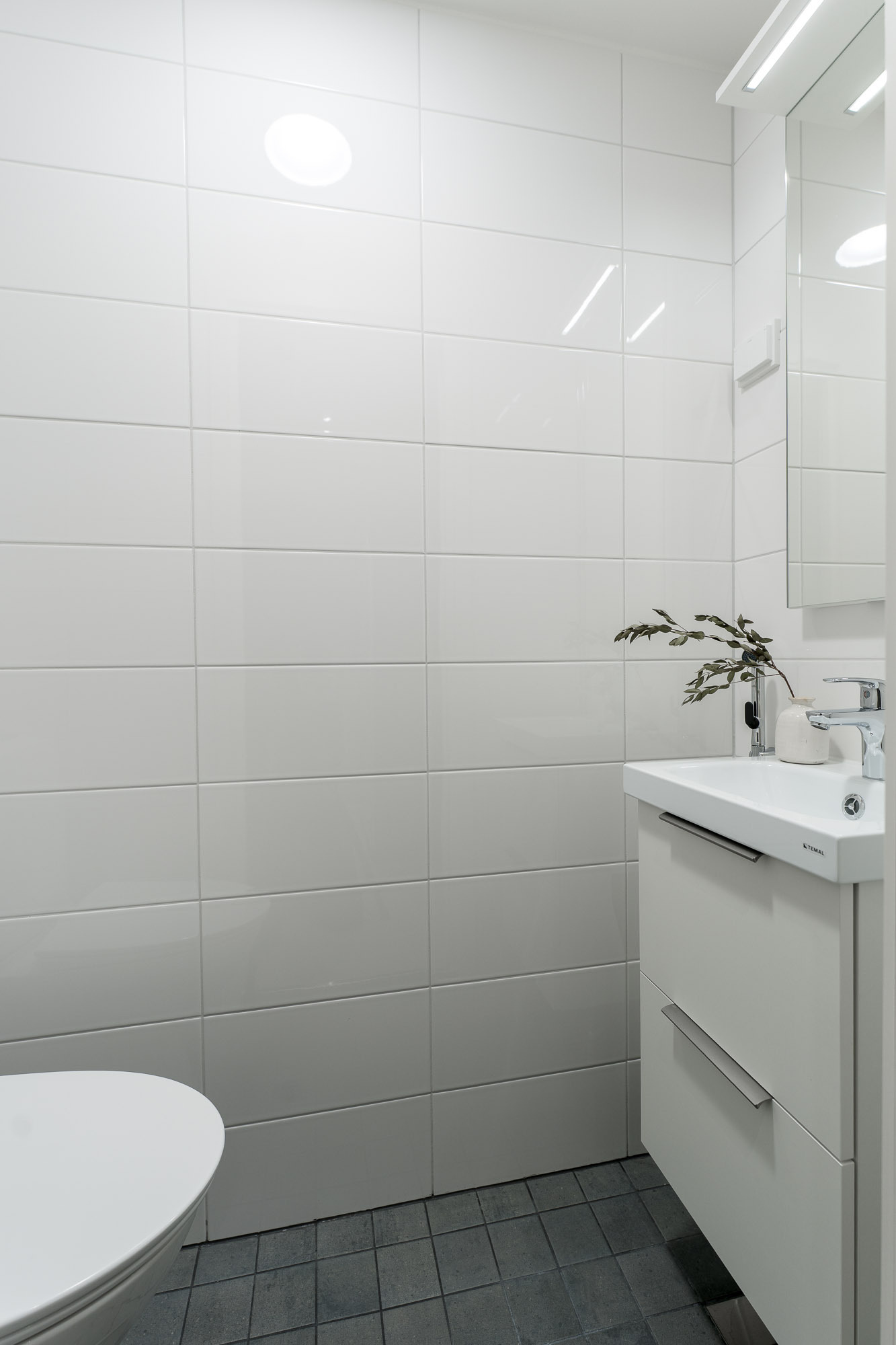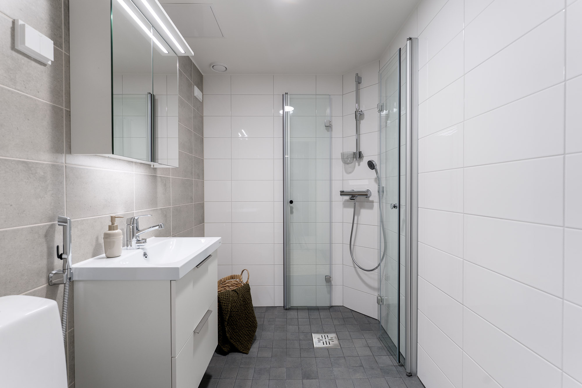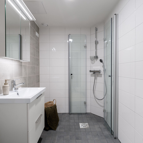 Varusteet: suihku, suihkuseinä, lattialämmitys, kiinteät valaisimet, pesukoneliitäntä, allaskaappi, peilikaappi