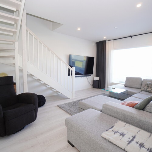 Tilavalta terassilta pääset suoraan ulkokautta johdettuja kierreportaita toisen kerroksen asuintiloihin.