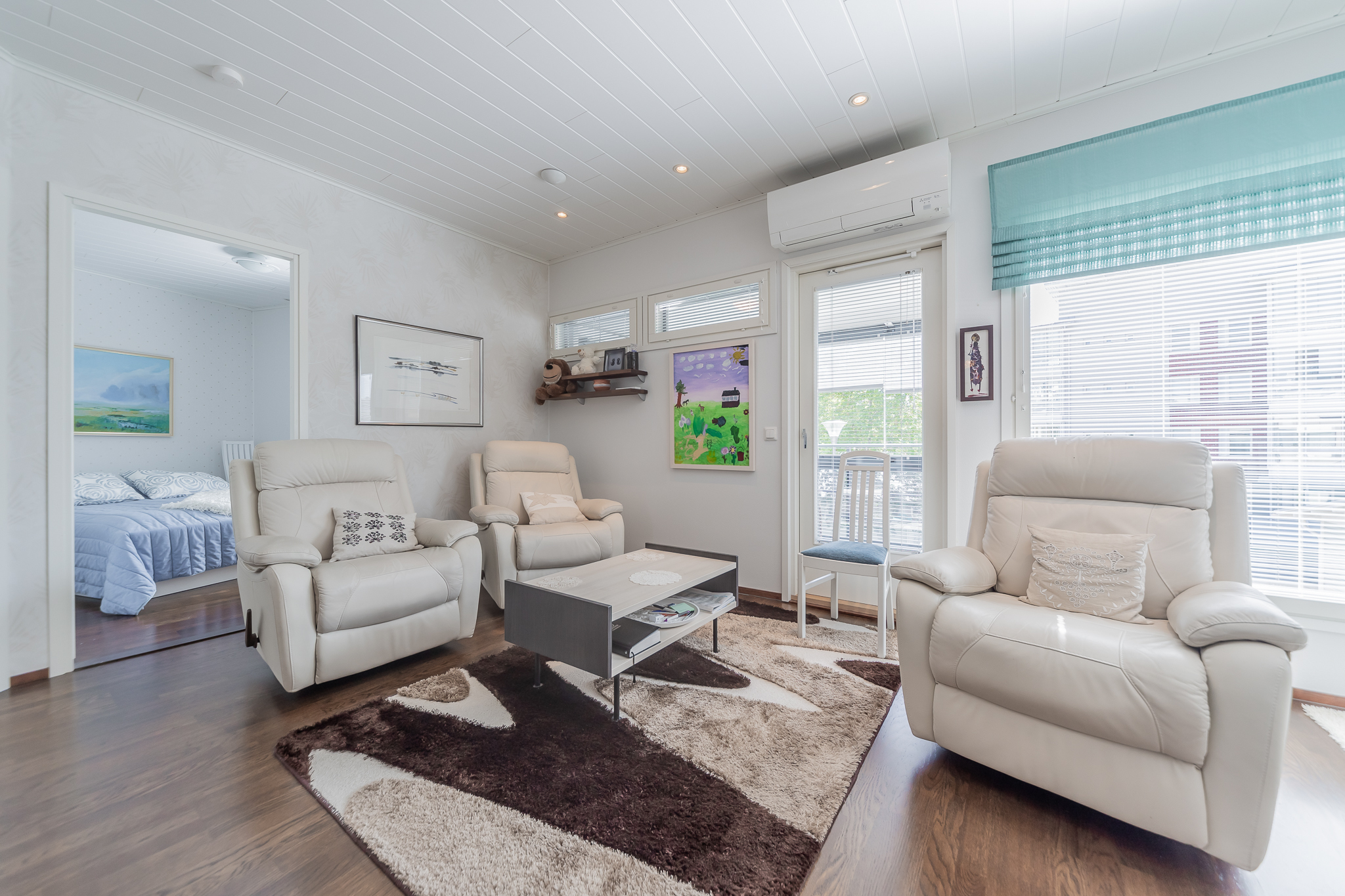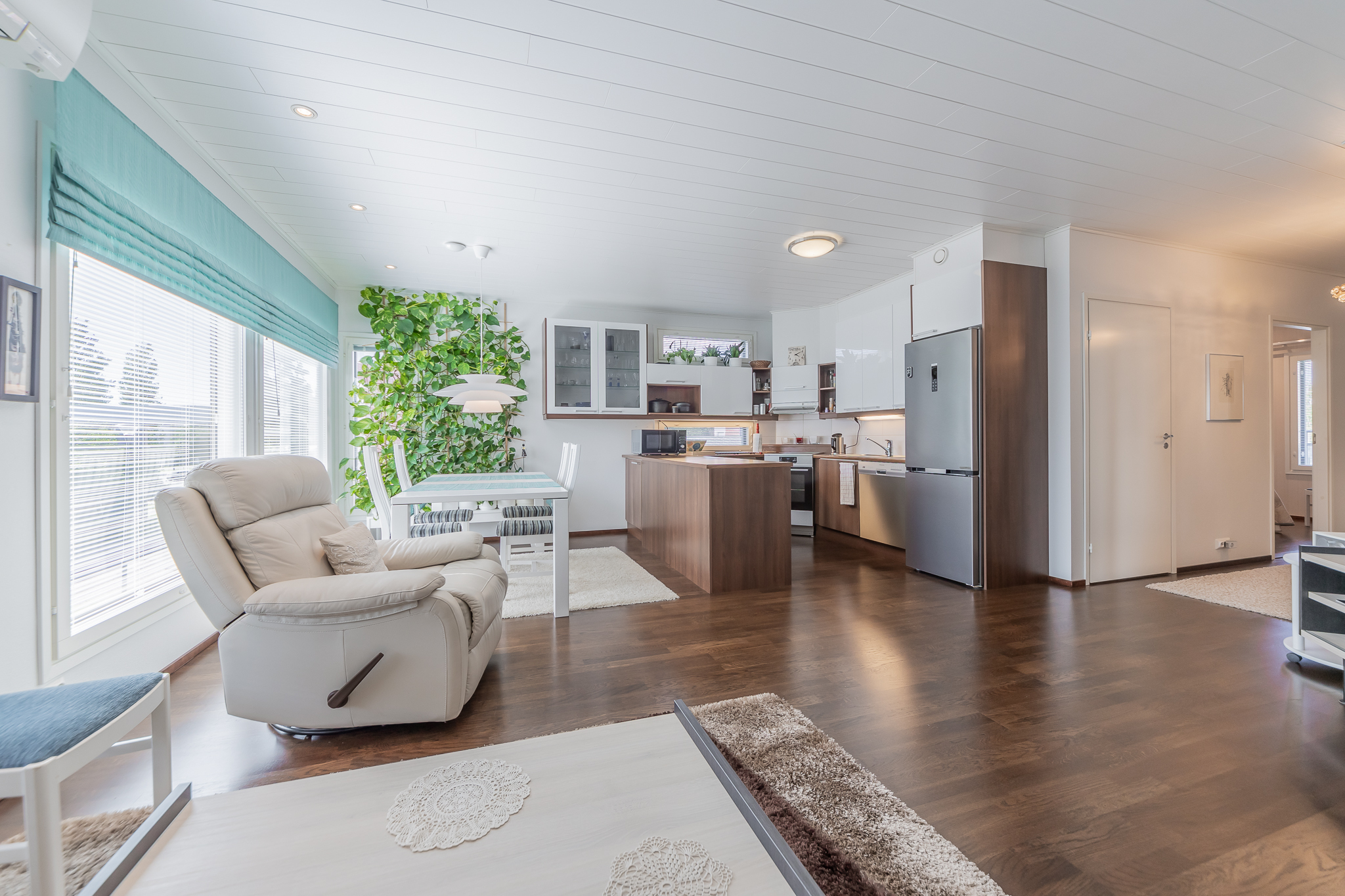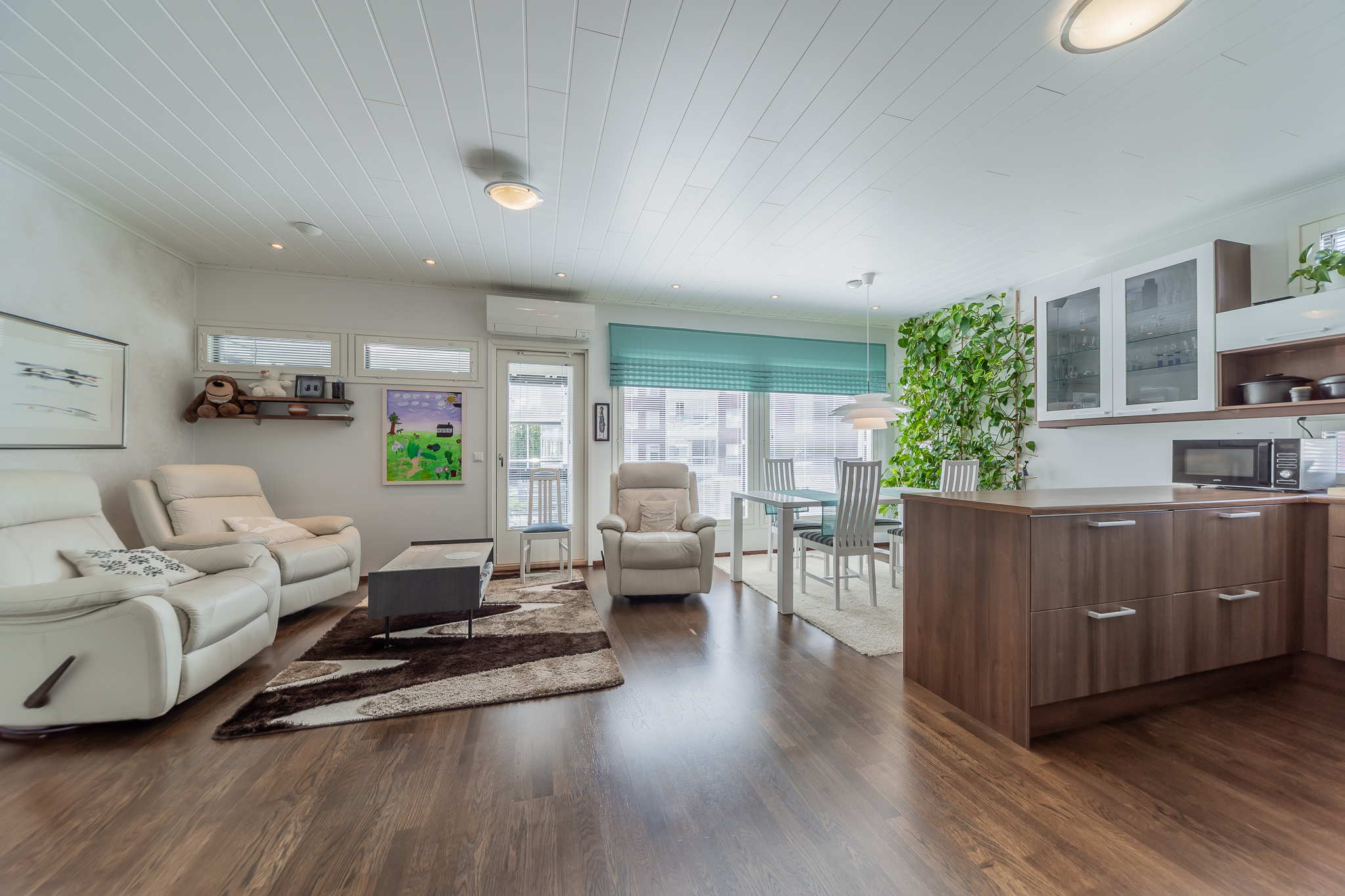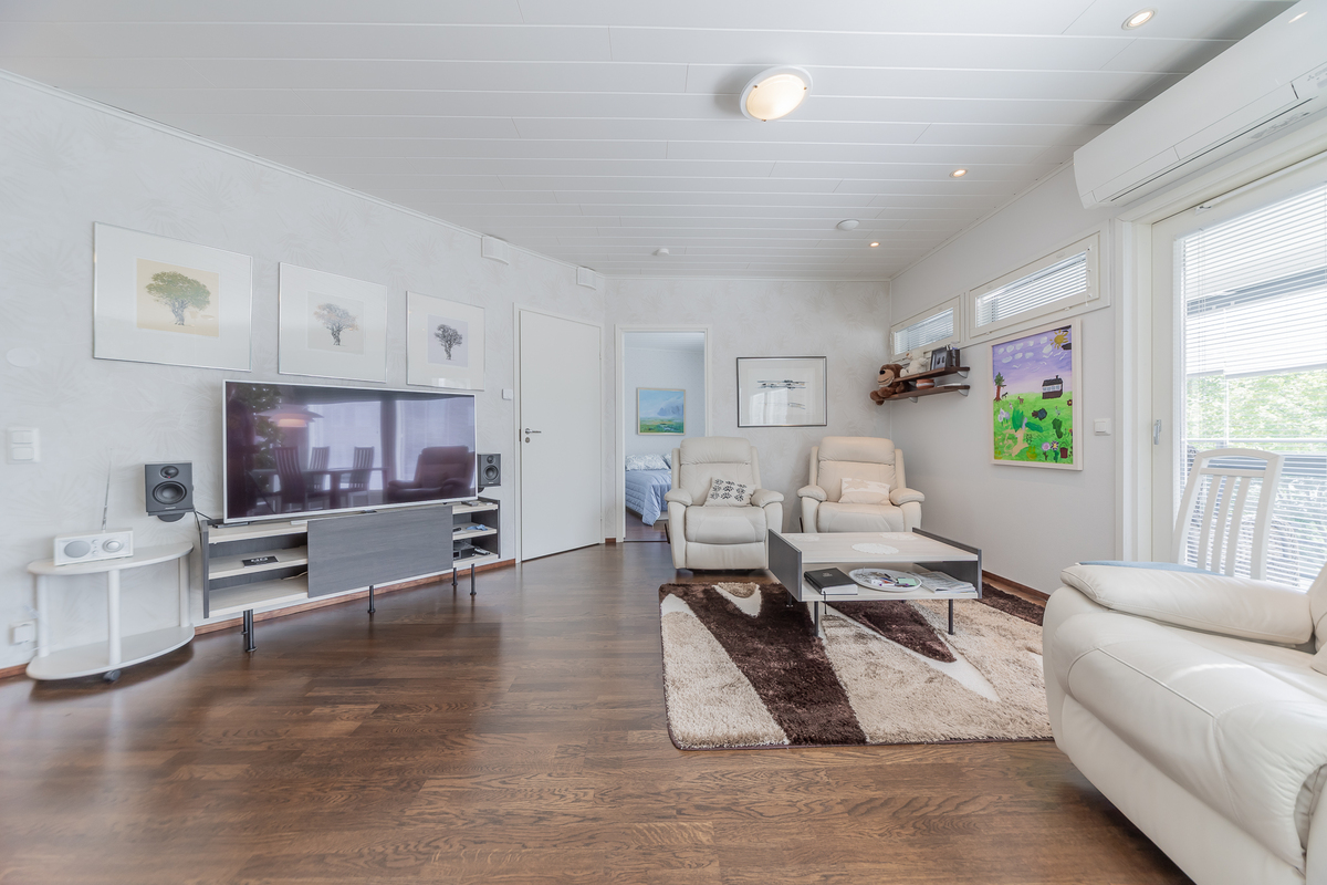 Keittiö avautuu suureen olohuoneeseen, jonne on asennettu ilmalämpöpumppu viilentämään helteisiä hetkiä. Olohuoneesta on käynti lasitetulle, isolle lännensuuntaiselle parvekkeelle.