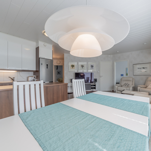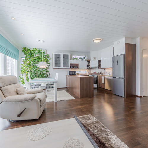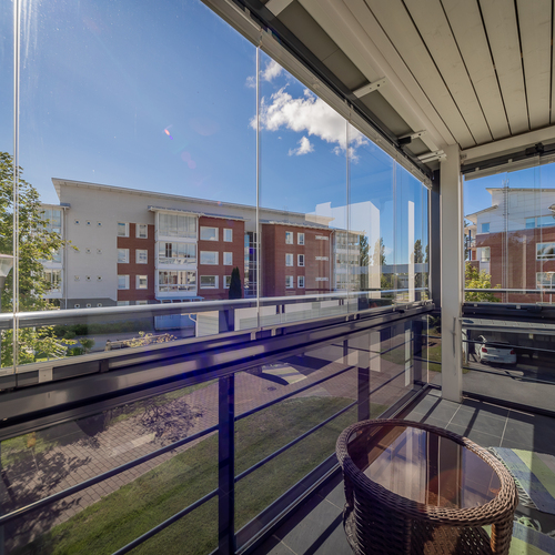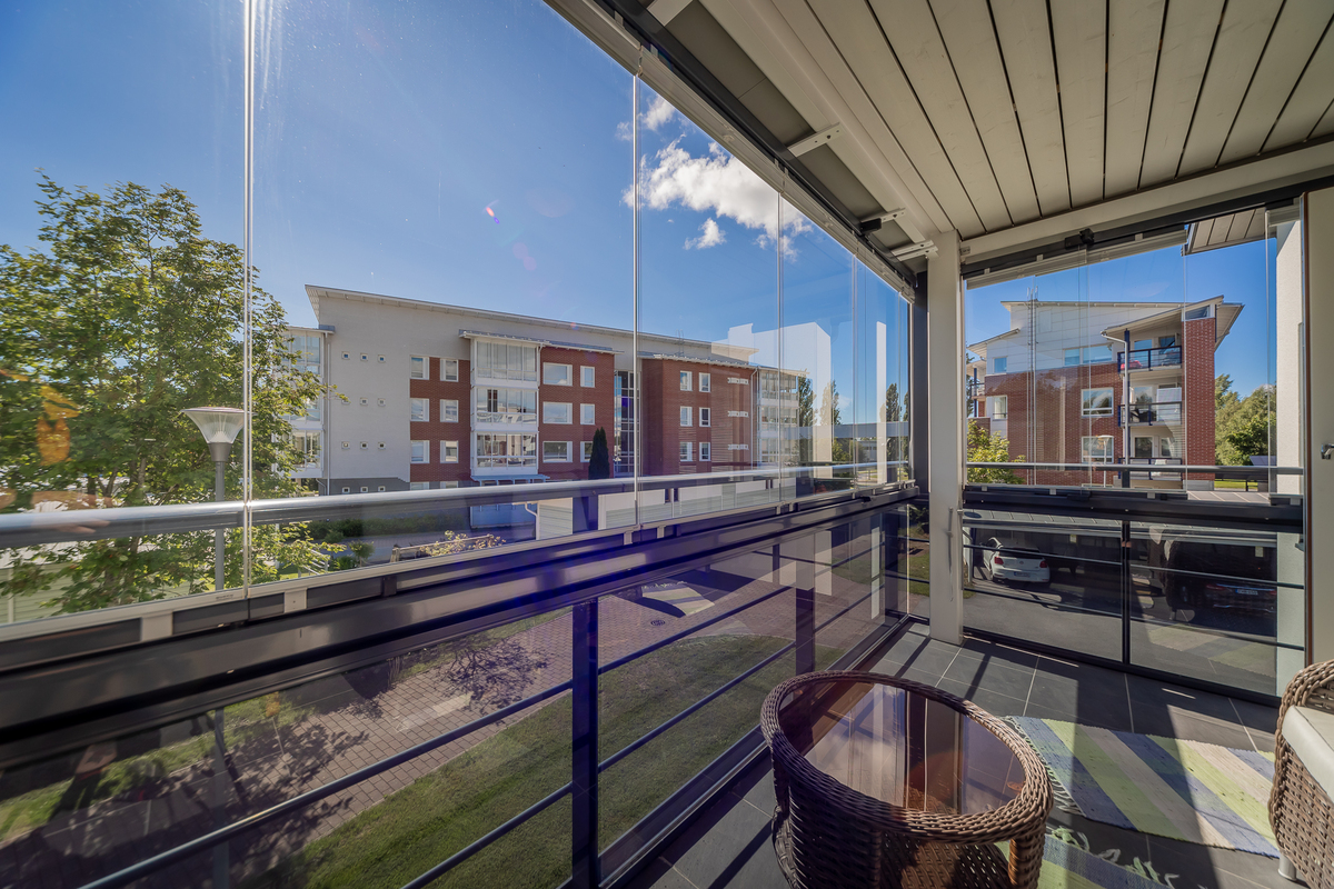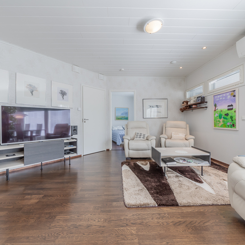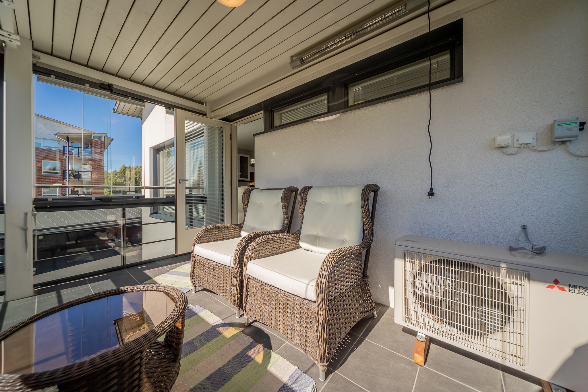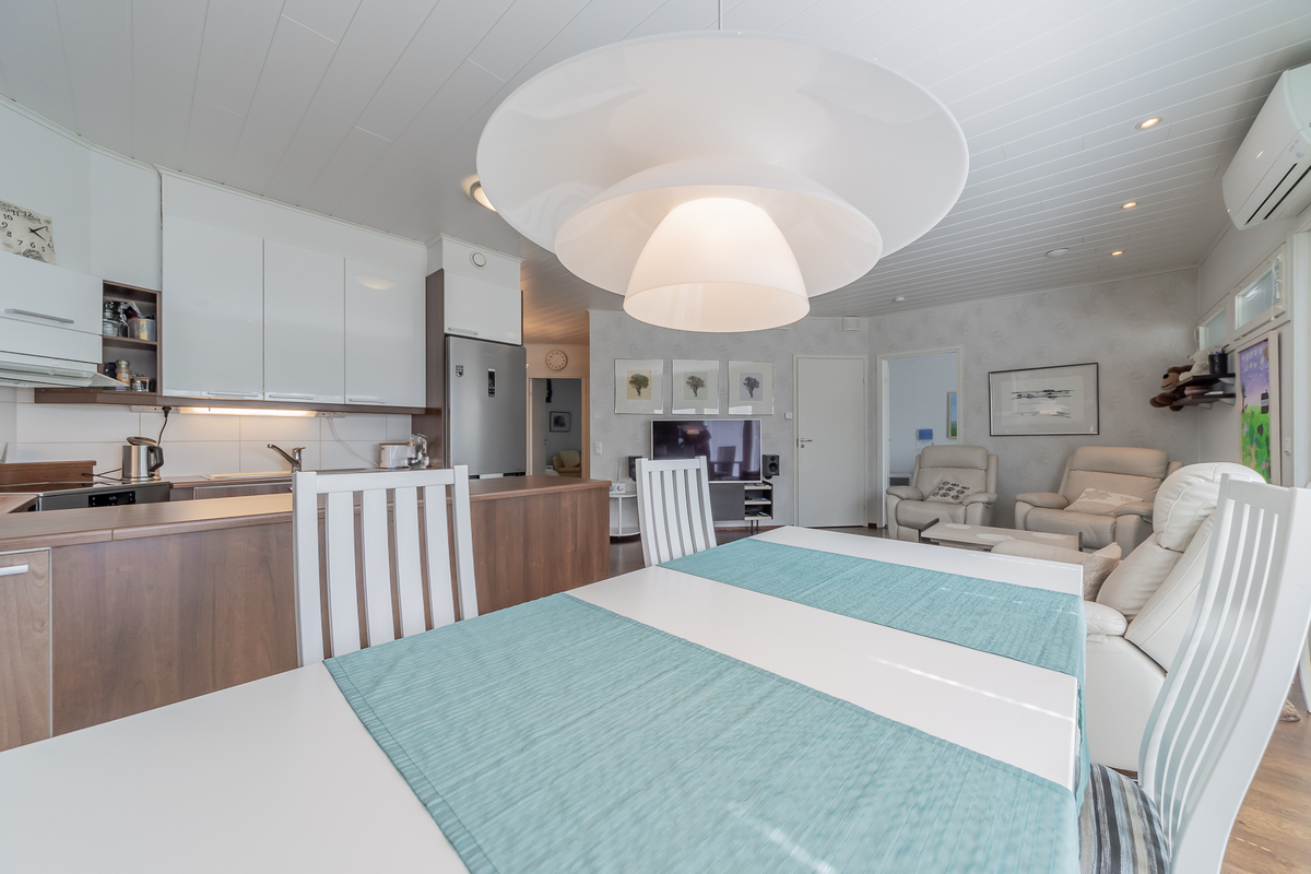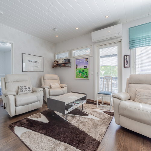 Keittiö avautuu suureen olohuoneeseen, jonne on asennettu ilmalämpöpumppu viilentämään helteisiä hetkiä. Olohuoneesta on käynti lasitetulle, isolle lännensuuntaiselle parvekkeelle.