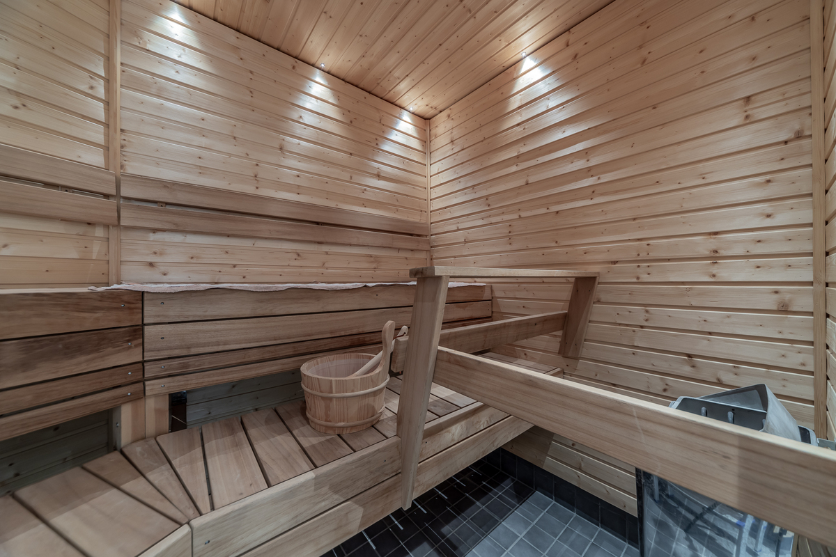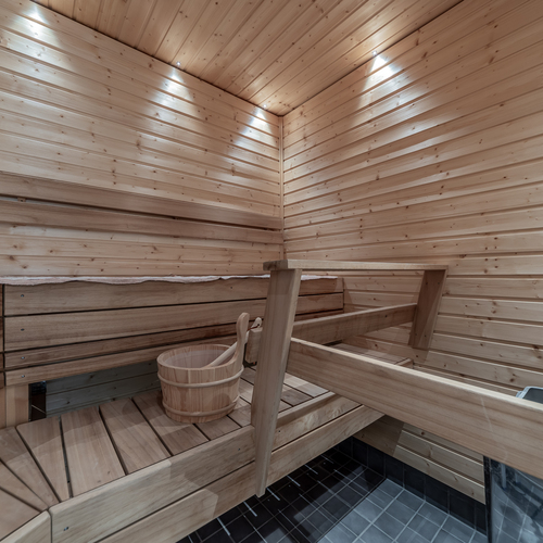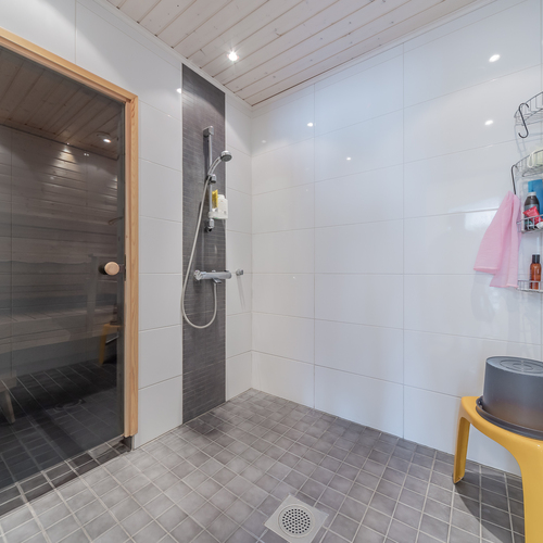 Oma sähkölämmitteinen sauna, seinillä paneeli, laattalattia