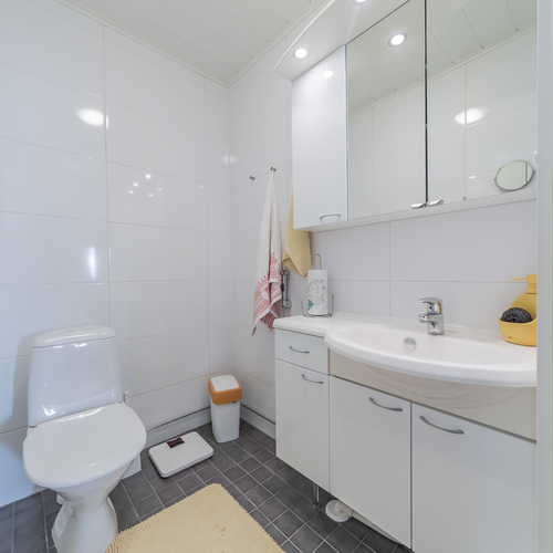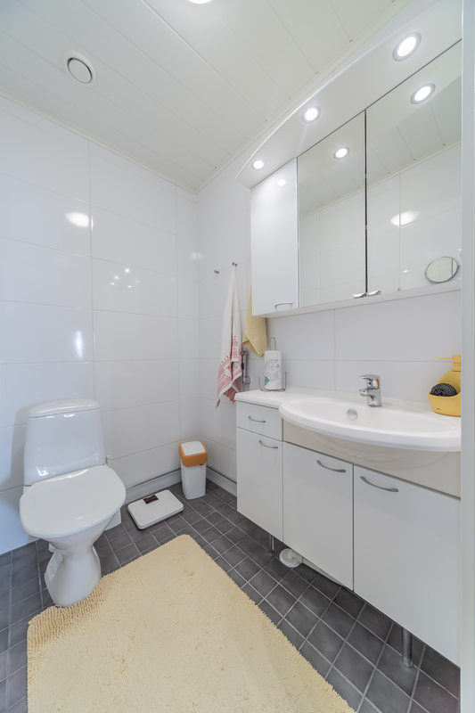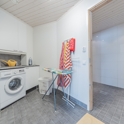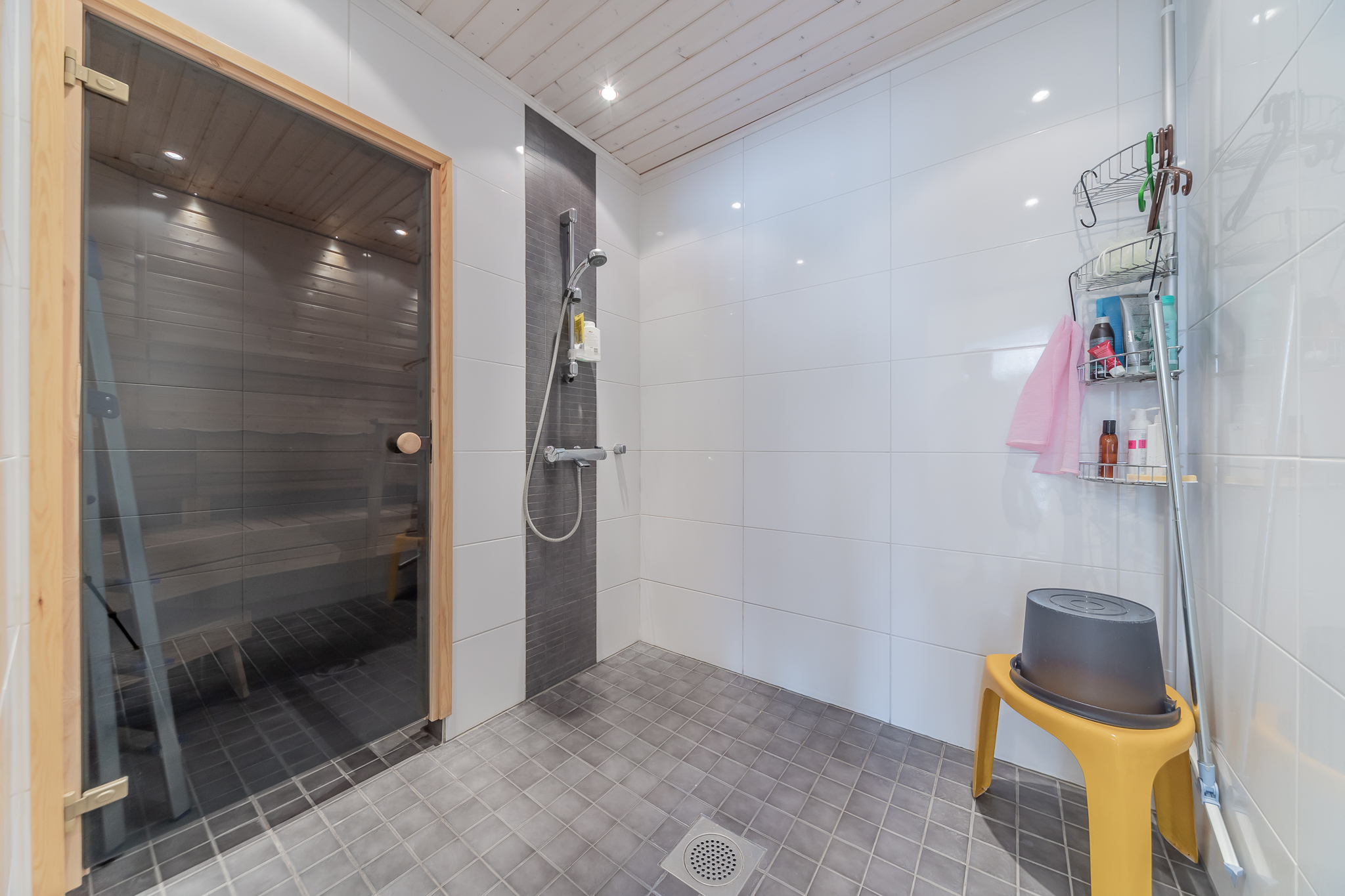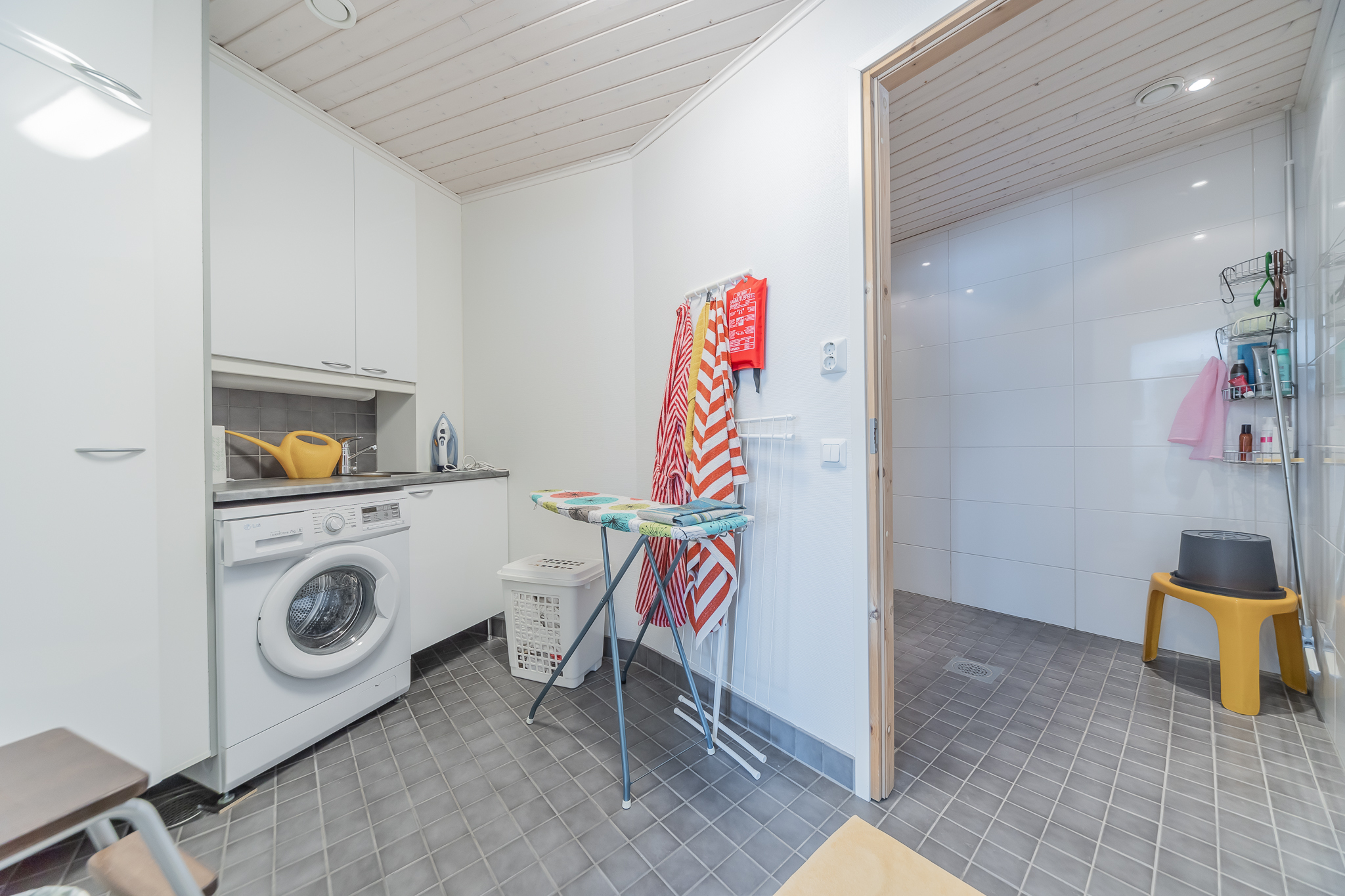 Kodinhoitohuoneessa on kaapistoa, allas sekä paikka pyykinpesukoneelle, tila sopii mainiosti myös pukuhuoneeksi. Laatoitettu kylpyhuone ja sähkölämmitteinen sauna, eteistilassa iso kalustettu wc.