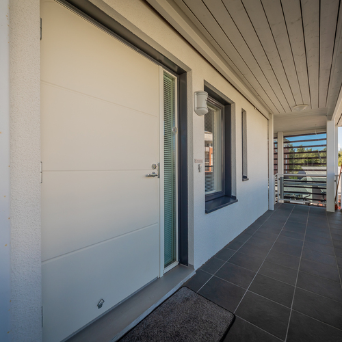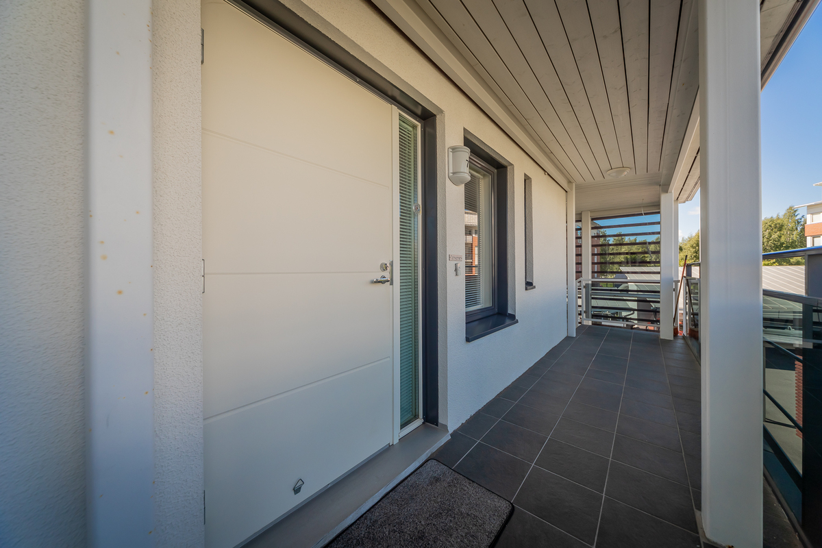 Päädyn portaiden kautta asunnon edessä olevalle katetulle parvekkeelle, josta käynti asuntoon – tervetuloa!