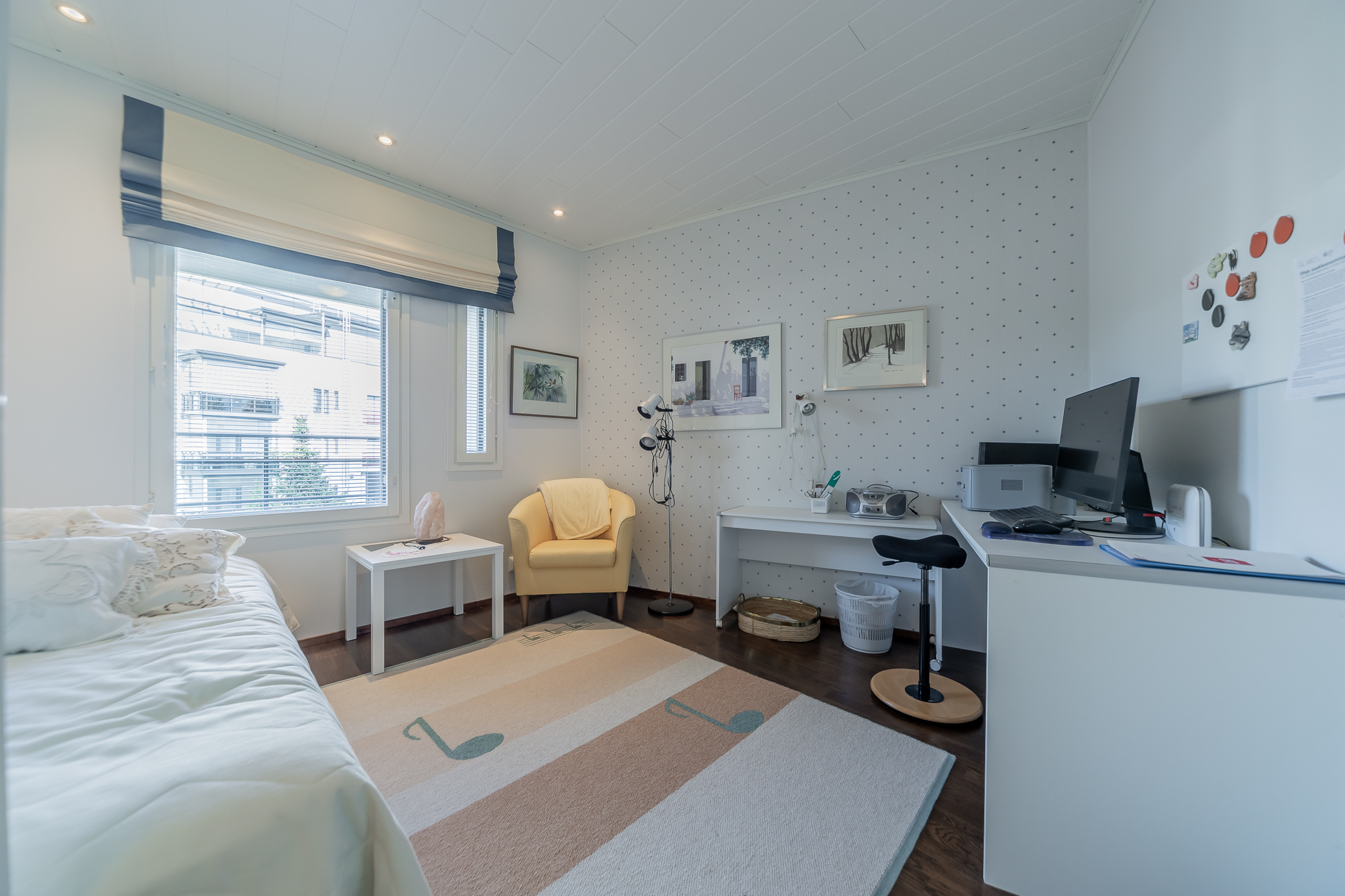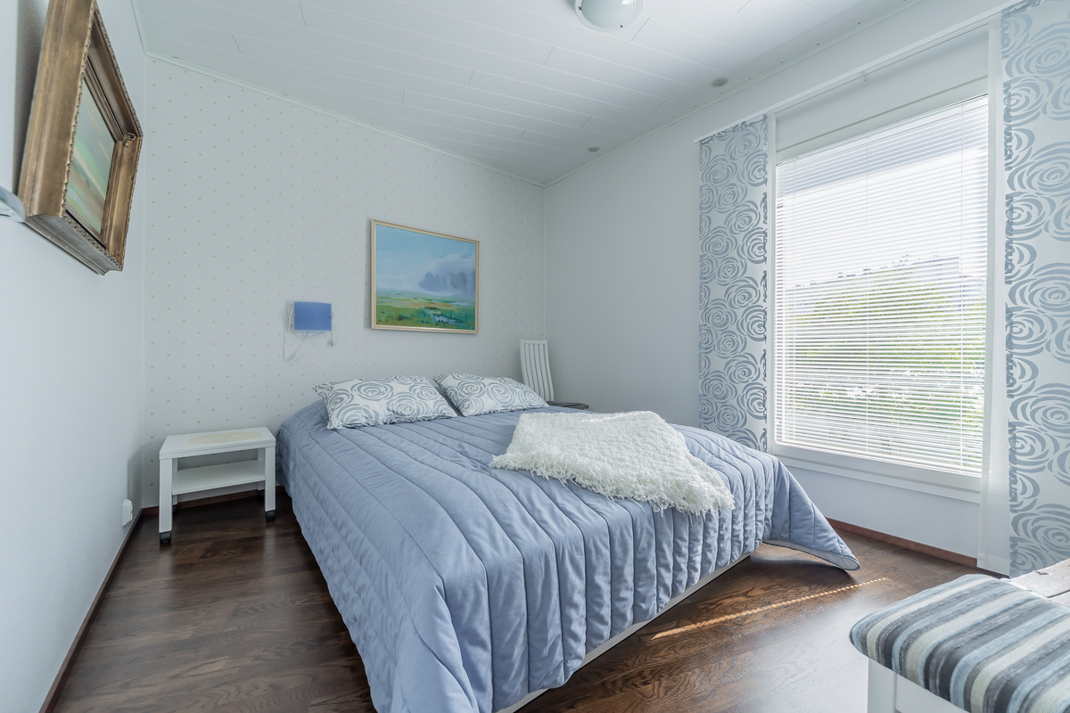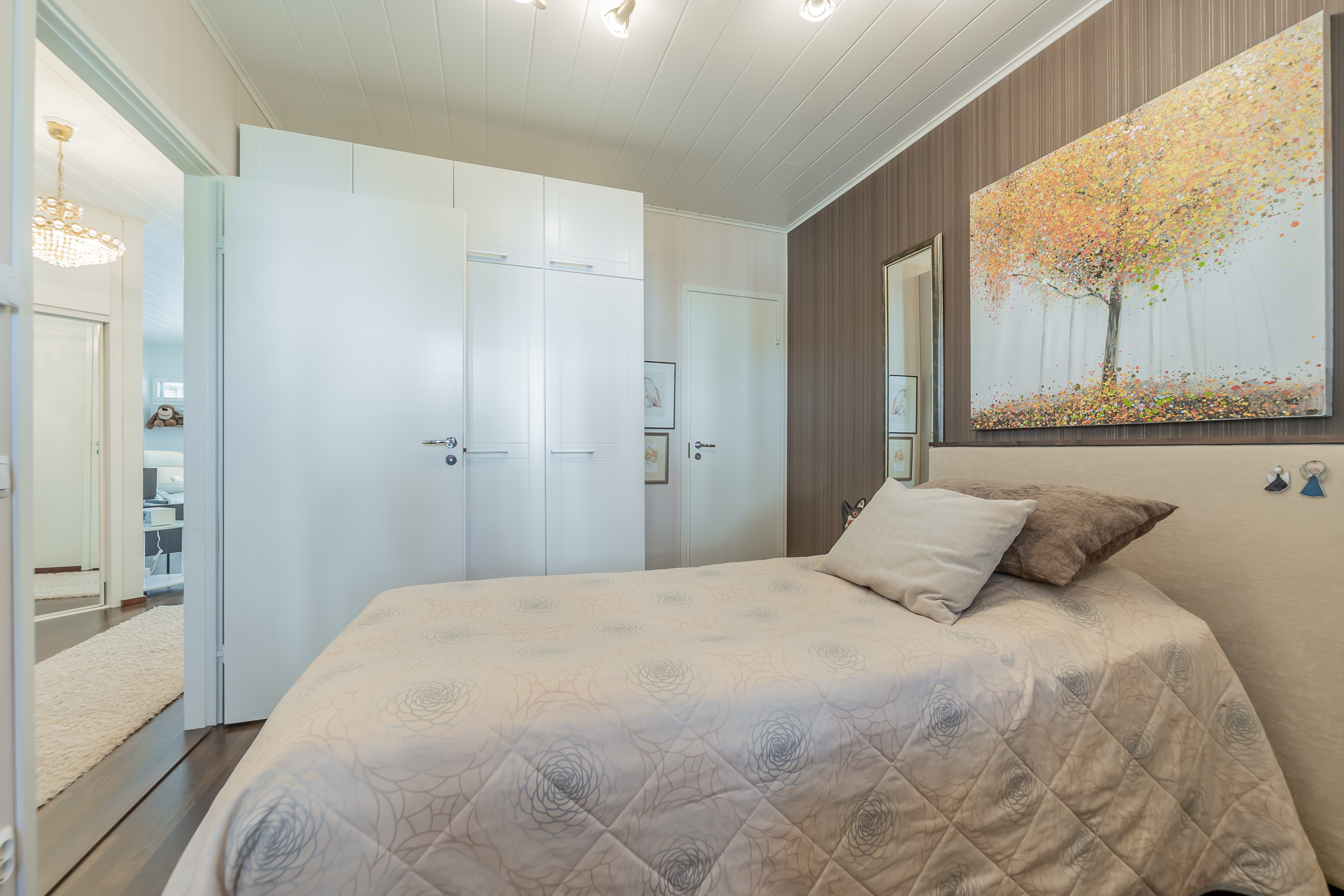 Asunnossa on kolme makuuhuonetta, yhdessä kaapiston lisäksi ikkunallinen vaatehuone, lisäksi toisessa on hyllykkö tarpeellisten tavaroiden säilytykseen.