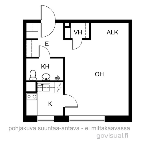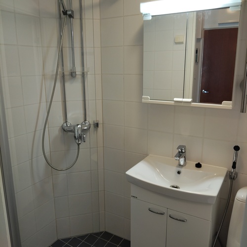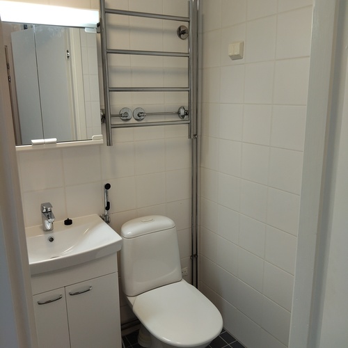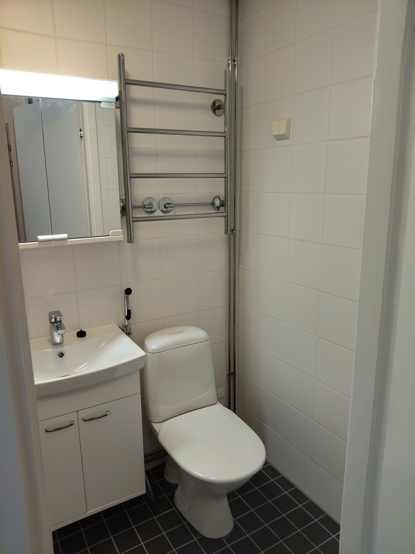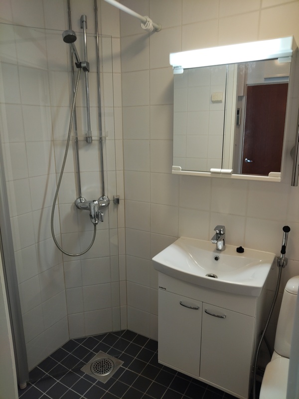 Suihku, suihkuseinäovi, pesukoneliitäntä, allaskaappi, peilikaappi, pyyhekuivain, wc-istuin, lattialämmitys. Lattia ja seinä laatoitettu, katto maalattu.