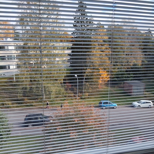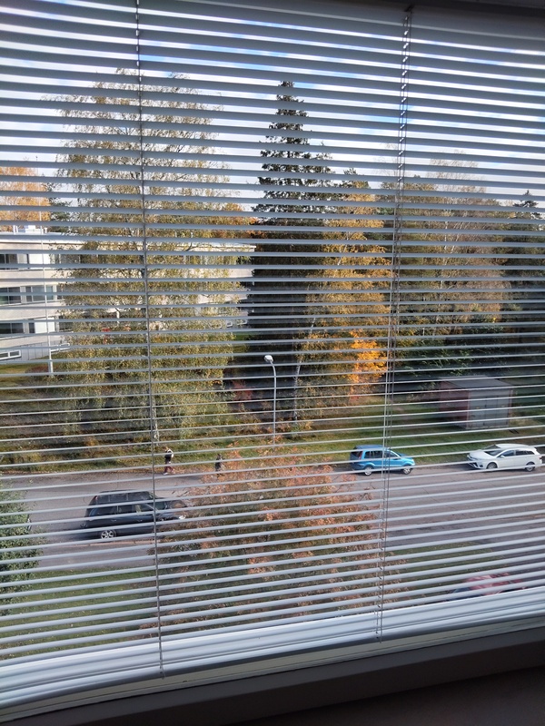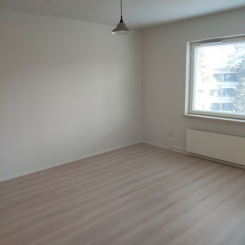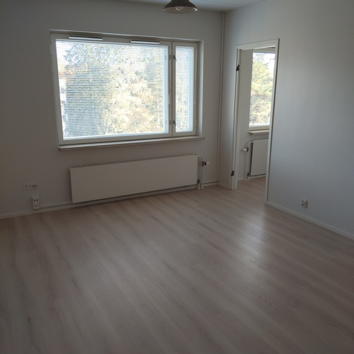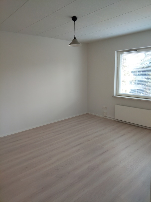 Lattia laminaattia, seinät ja katto maalattu, ikkunassa sälekaihtimet.