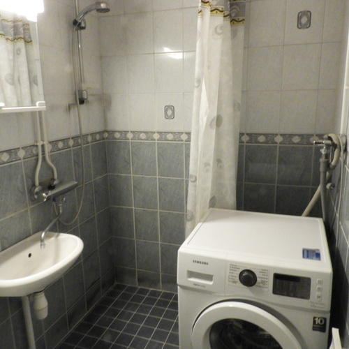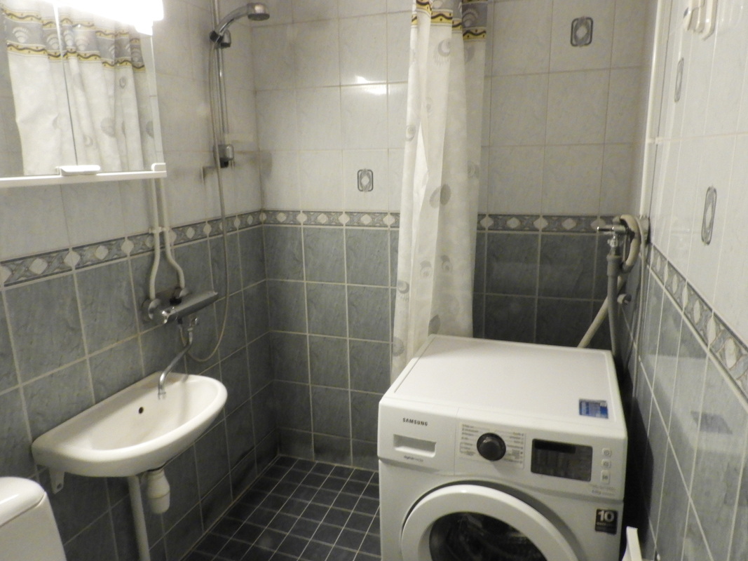 Varusteet: lattiaan asennettu WC, bidee, peilikaappi, pesukoneliitäntä