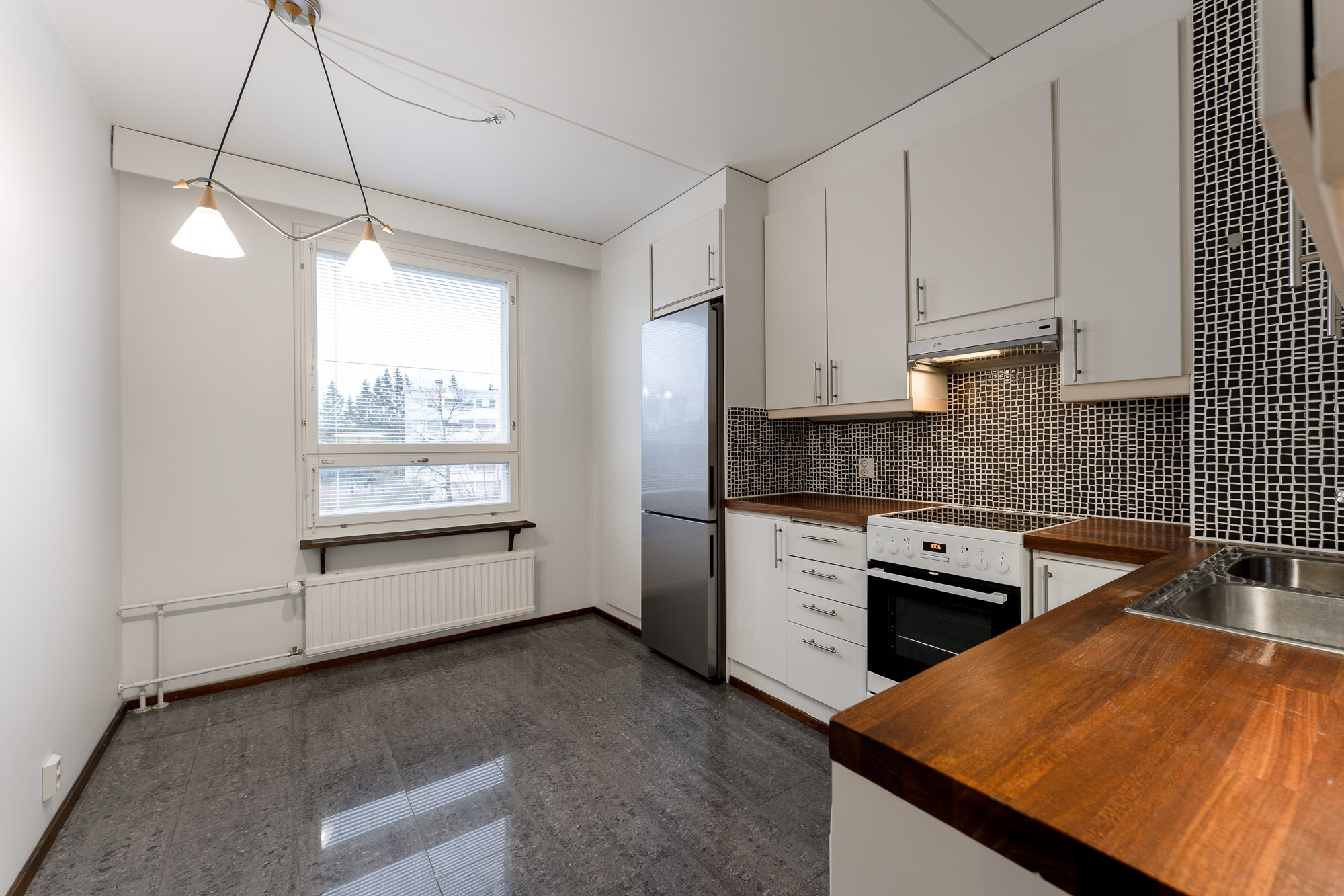 Lattia kivilaatta, seinät ja katto maalattu. Ikkunassa sälekaihtimet.