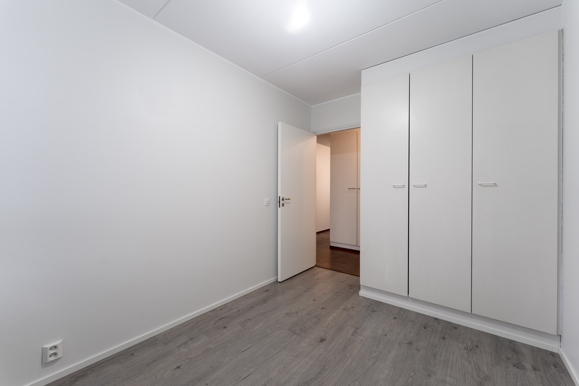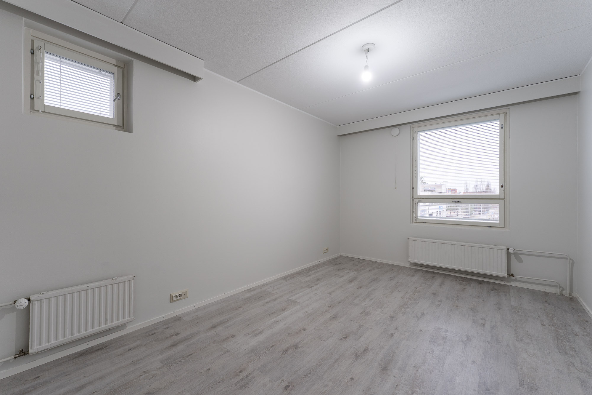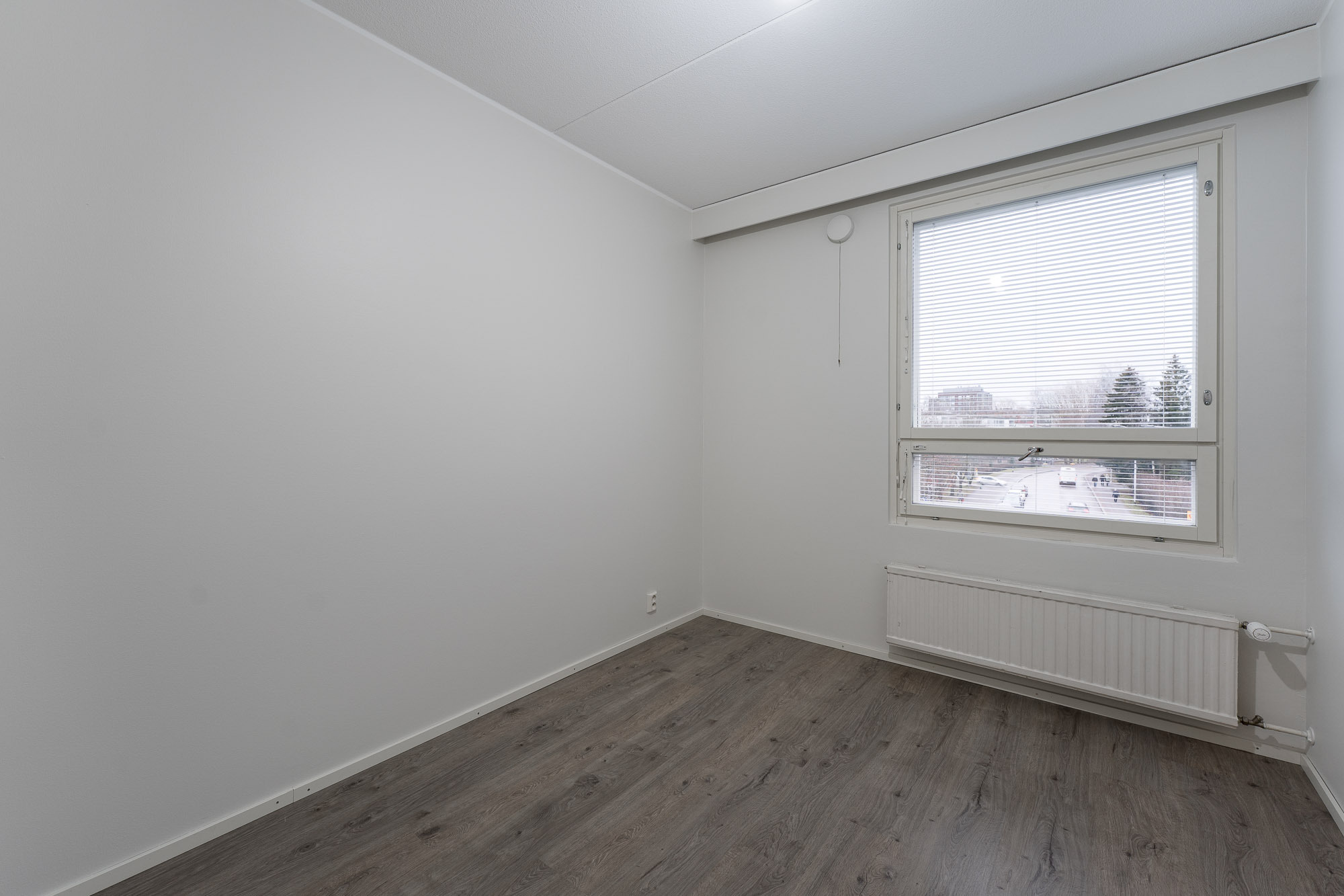 Makuuhuone 2: Mh 2: lattia laminaatti, seinät ja katto maalattu, kaapisto. Ikkunassa sälekaihtimet.