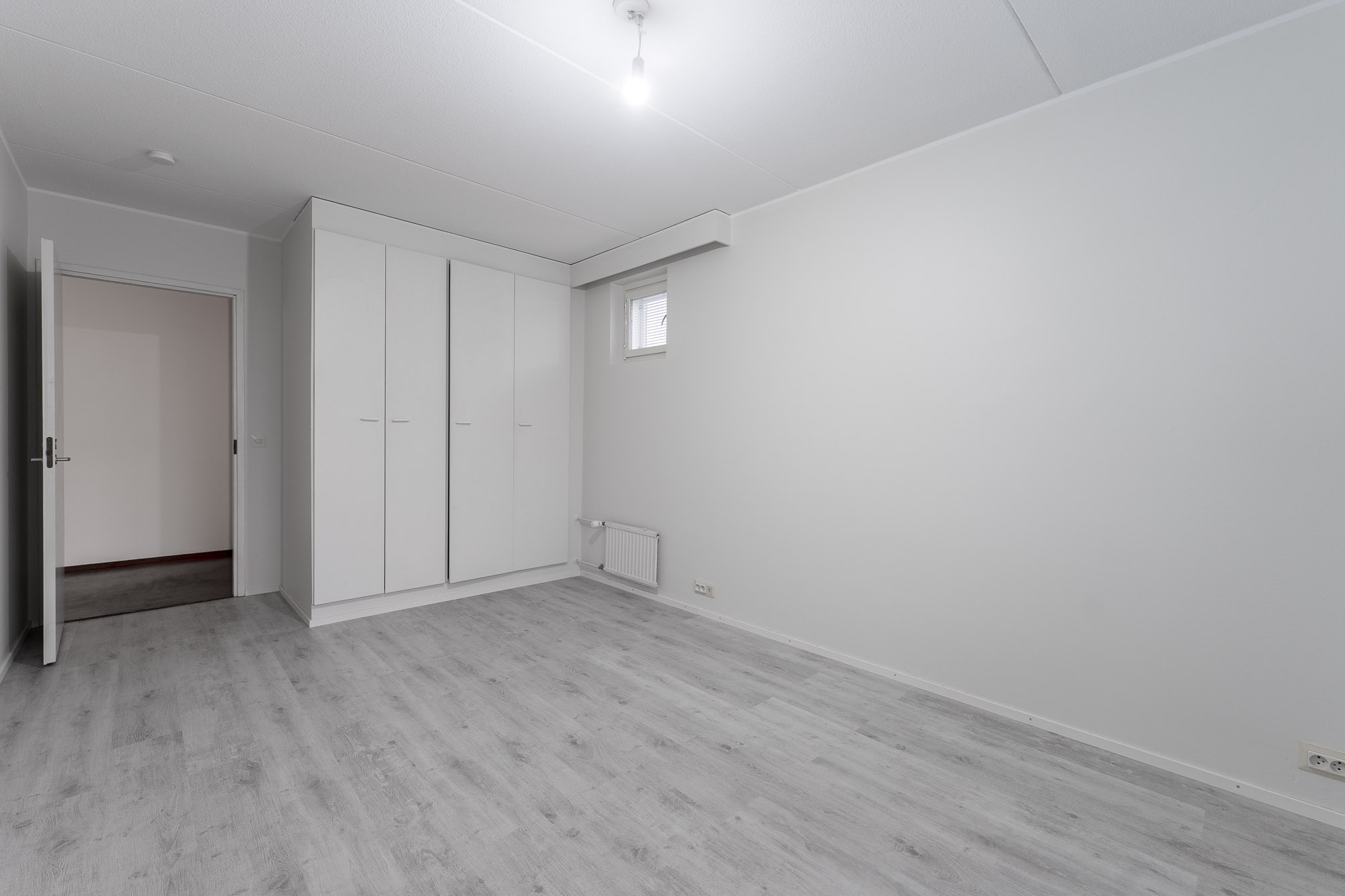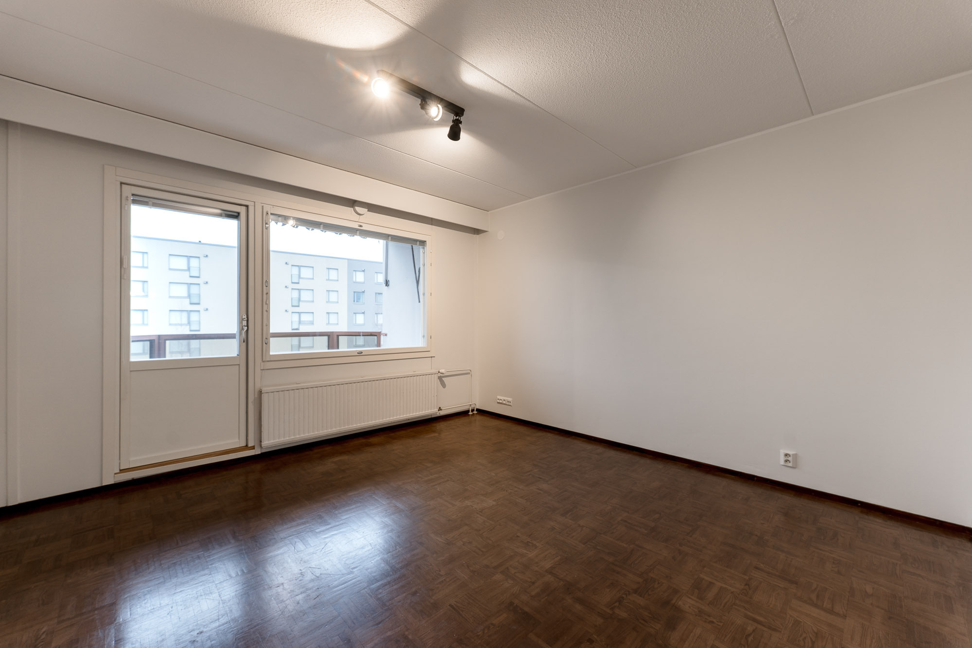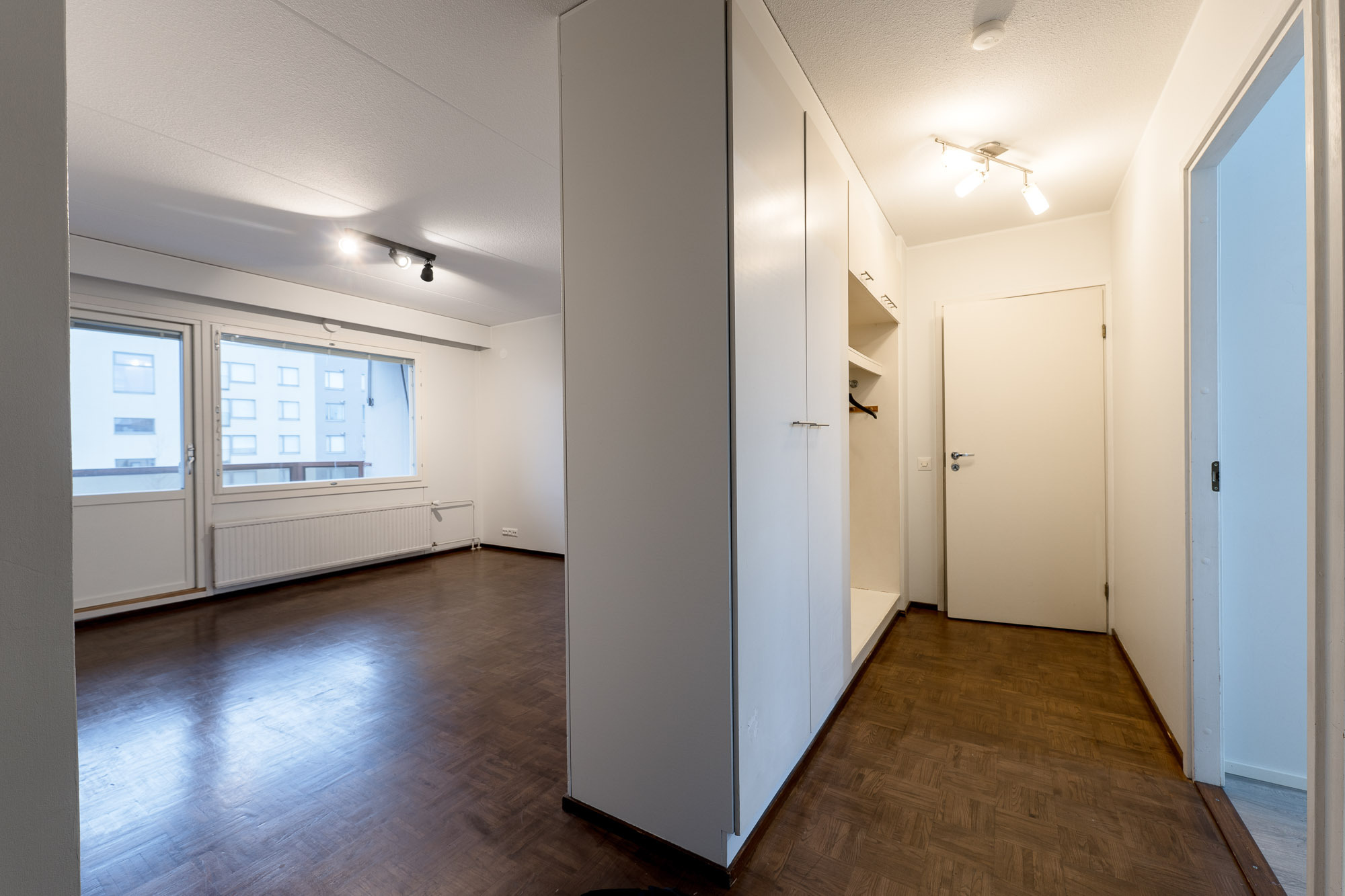 Makuuhuone 2: Mh 2: lattia laminaatti, seinät ja katto maalattu, kaapisto. Ikkunassa sälekaihtimet.