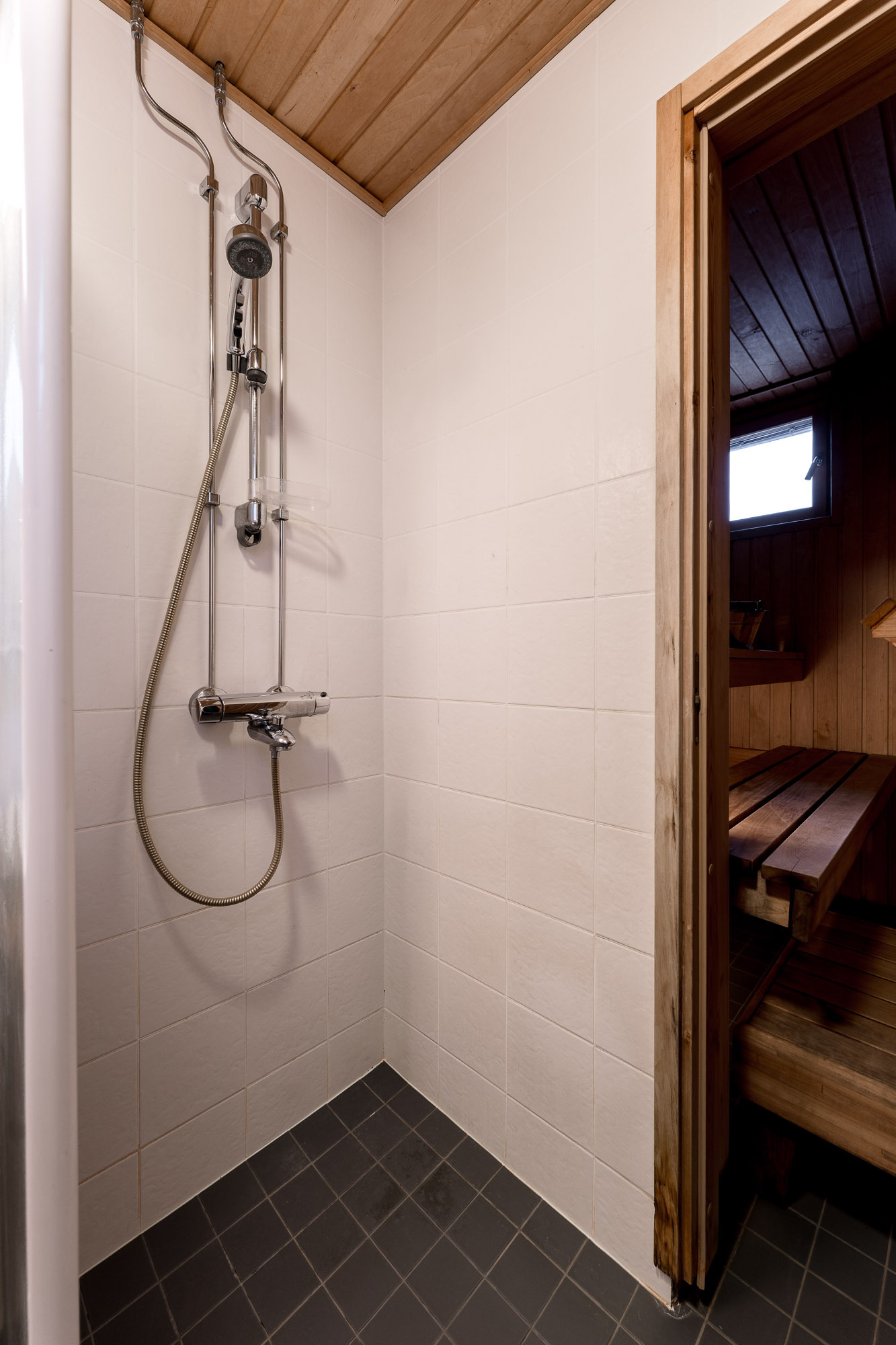 Sähkökiuas, lauteet, ikkuna, seinät ja katto paneloitu, lattia laatta.