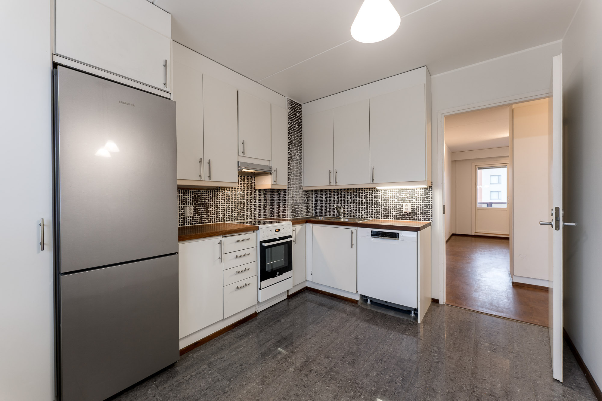 Keittiössä on nykyaikaiset kodinkoneet induktioliesi ja astianpesukone mukaan lukien, ja lattioissa on laadukkaita materiaaleja parkettia ja kivilaattaa. Ikkunoissa on sälekaihtimet ja huoneistoissa riittävästi säilytystilaa kiinteiden kaapistojen ansiosta.