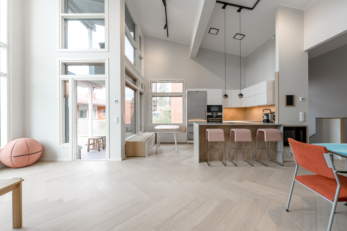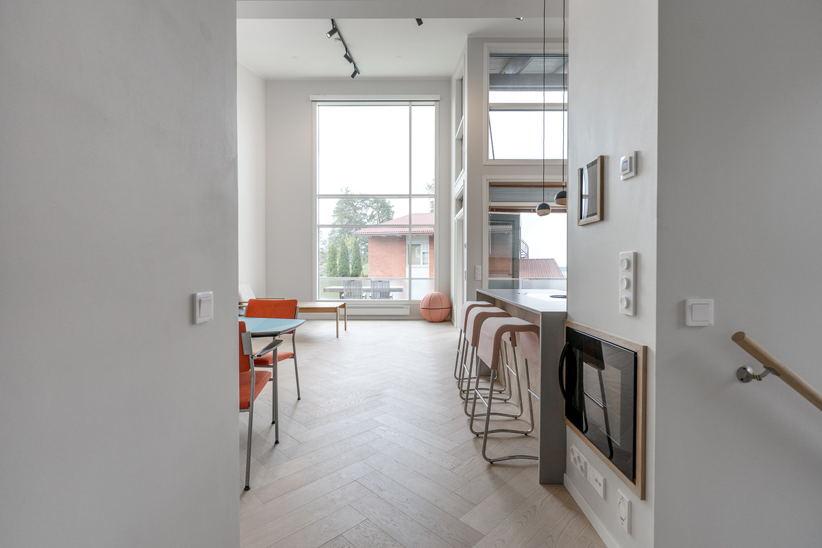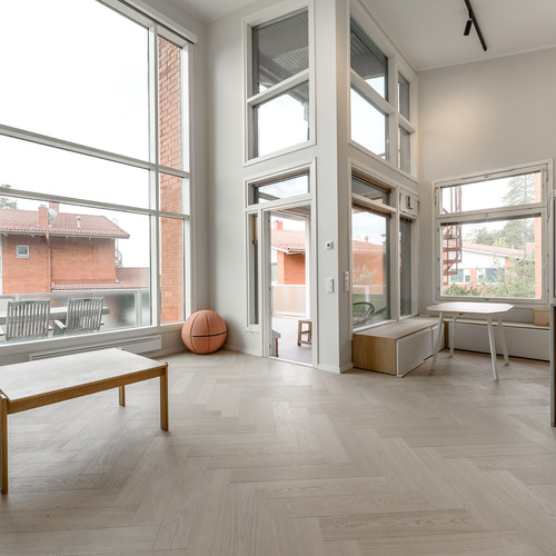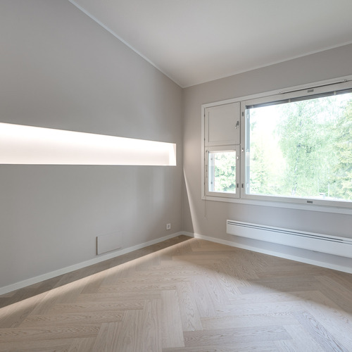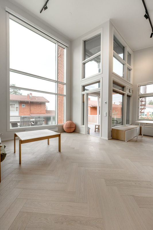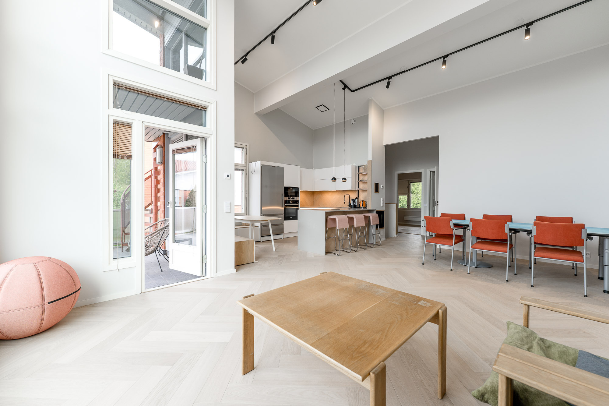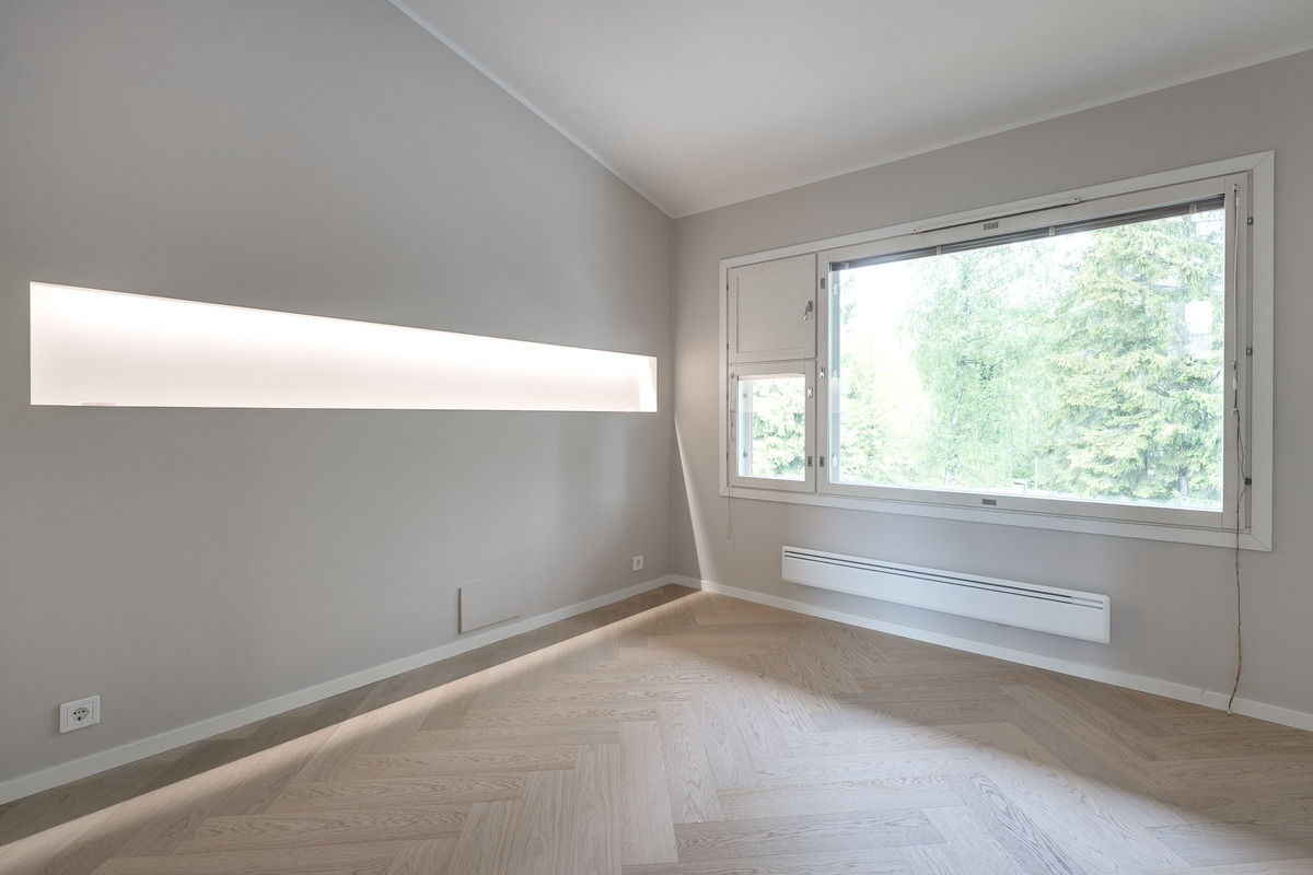 Erittäin korkea vinokatto, suuren ikkunat, isoimmassa kauko-ohjattu valosuodinrullaverho, kiinteät valaisimet, lattia kalanruotoparketti, seinät ja katto maalattu.