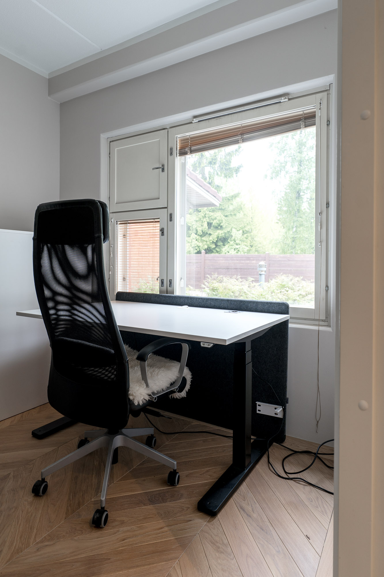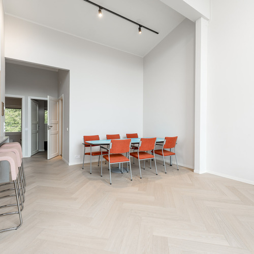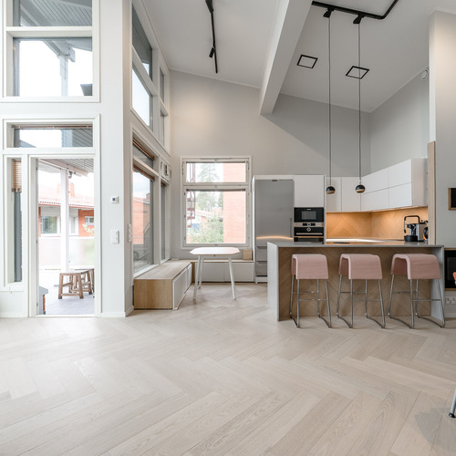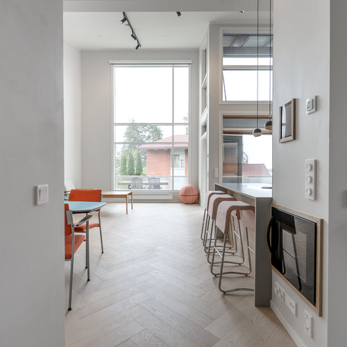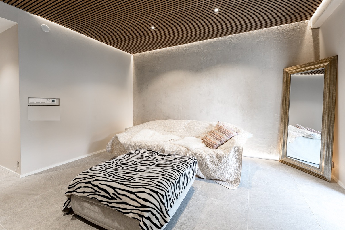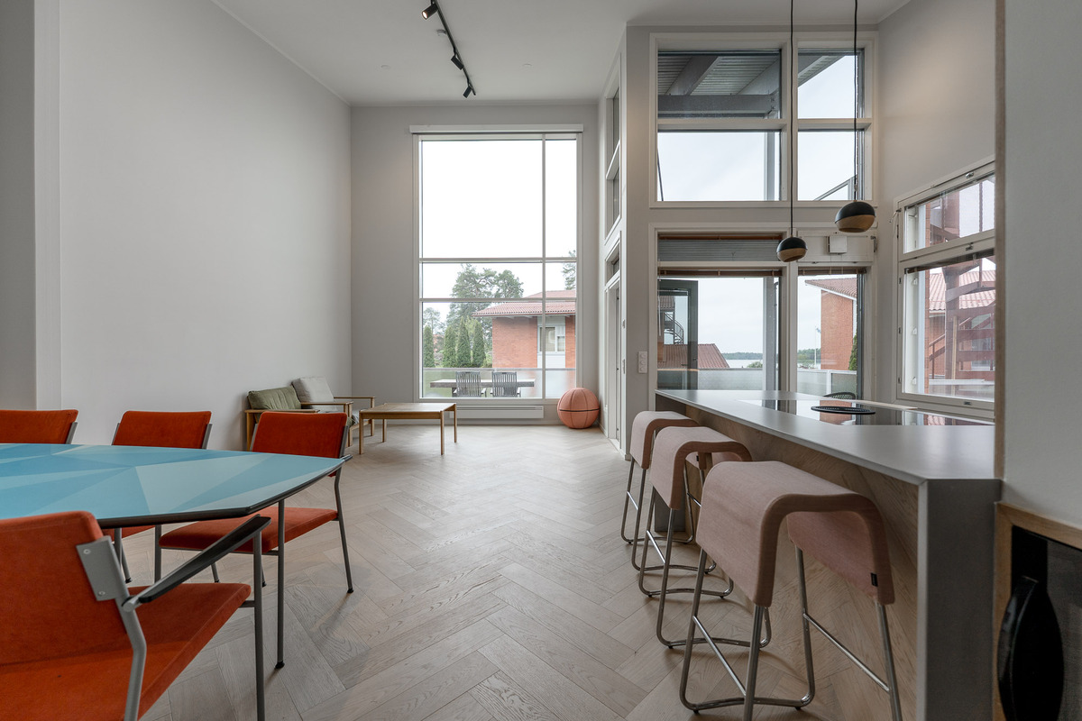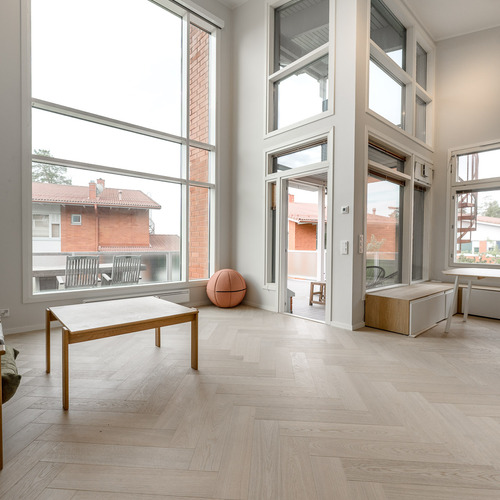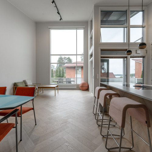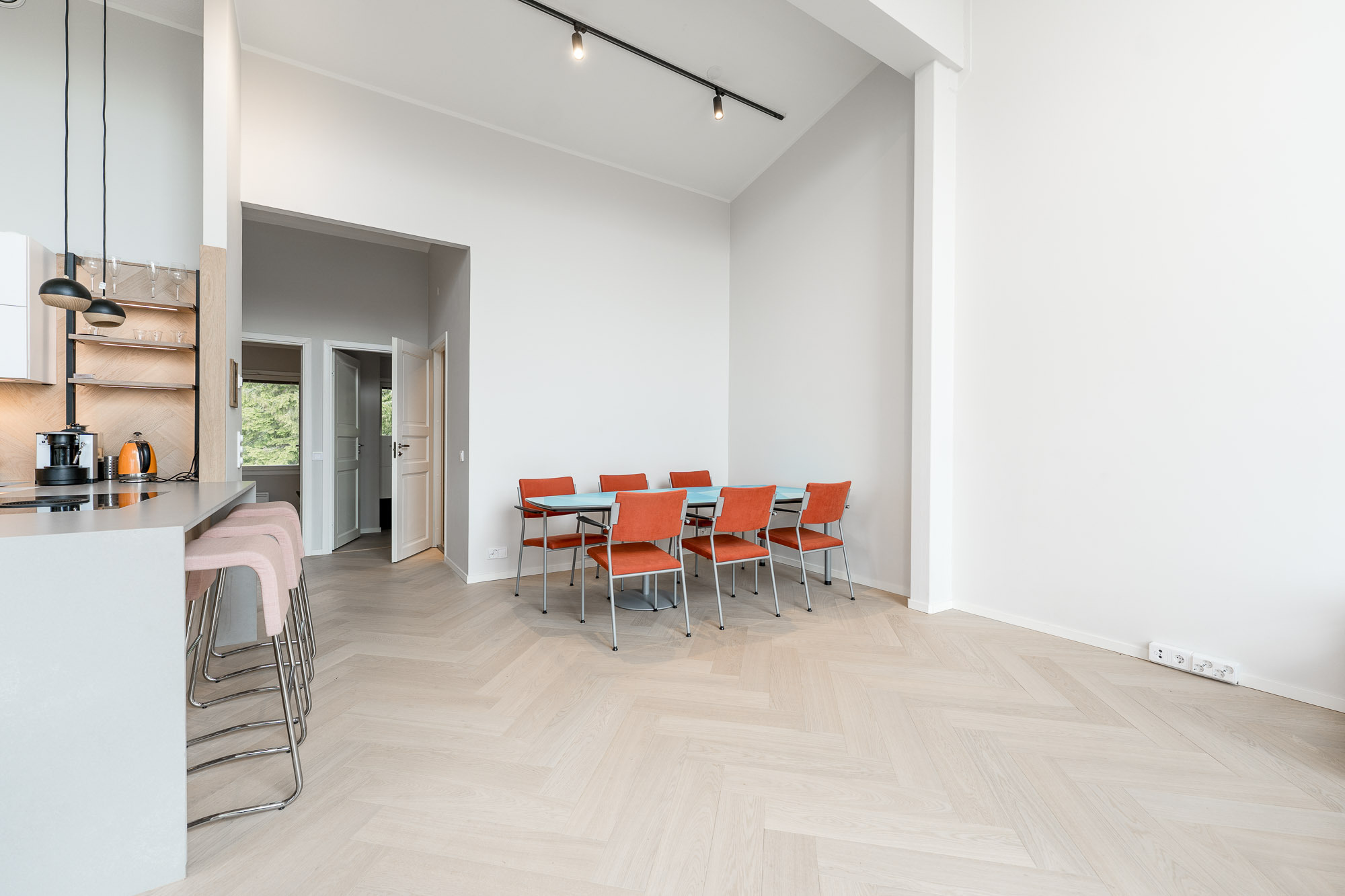 Erittäin korkea vinokatto, suuren ikkunat, isoimmassa kauko-ohjattu valosuodinrullaverho, kiinteät valaisimet, lattia kalanruotoparketti, seinät ja katto maalattu.