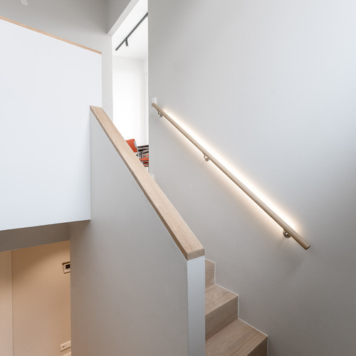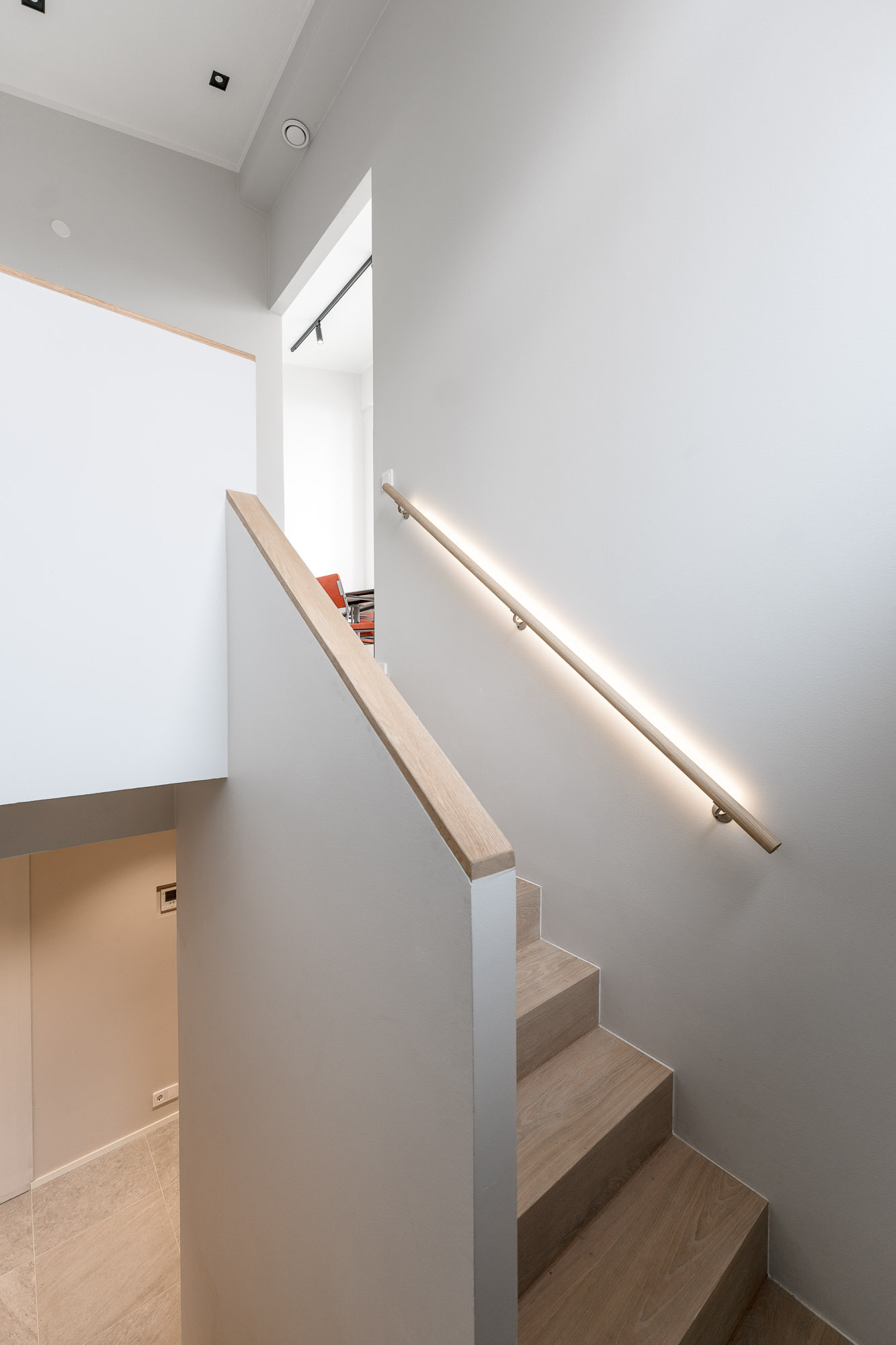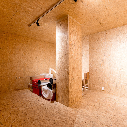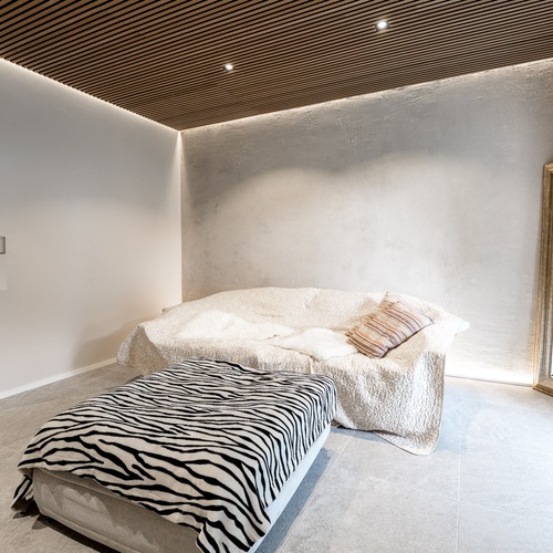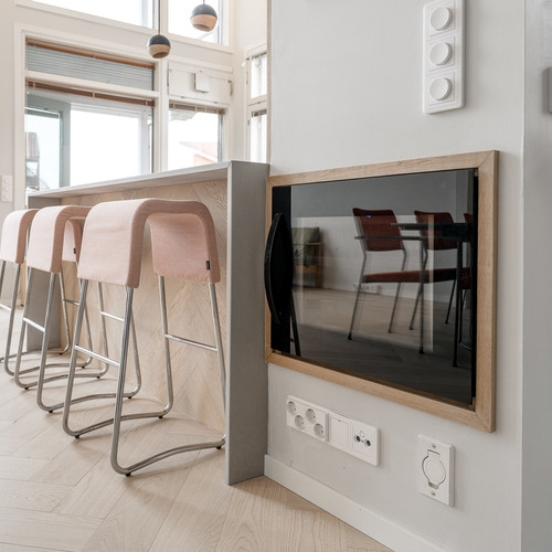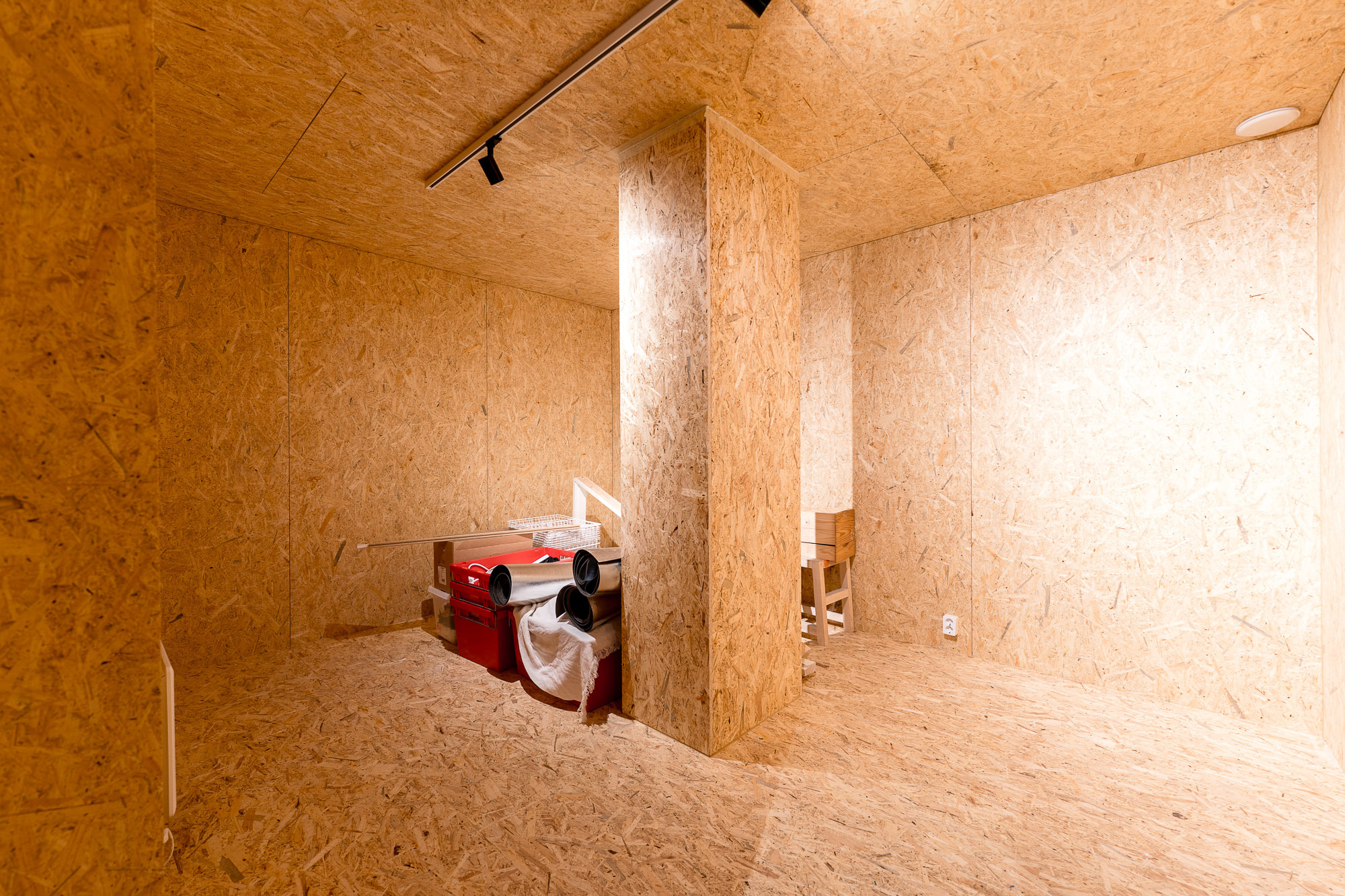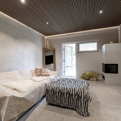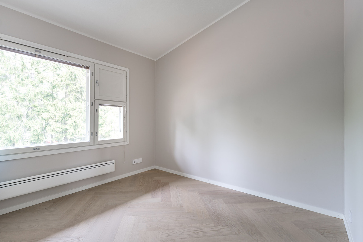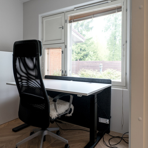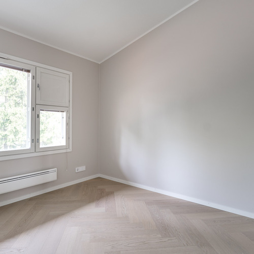 Erittäin korkea vinokatto, suuren ikkunat, isoimmassa kauko-ohjattu valosuodinrullaverho, kiinteät valaisimet, lattia kalanruotoparketti, seinät ja katto maalattu.