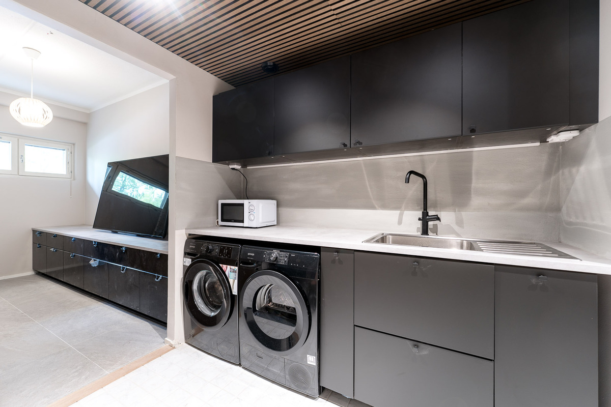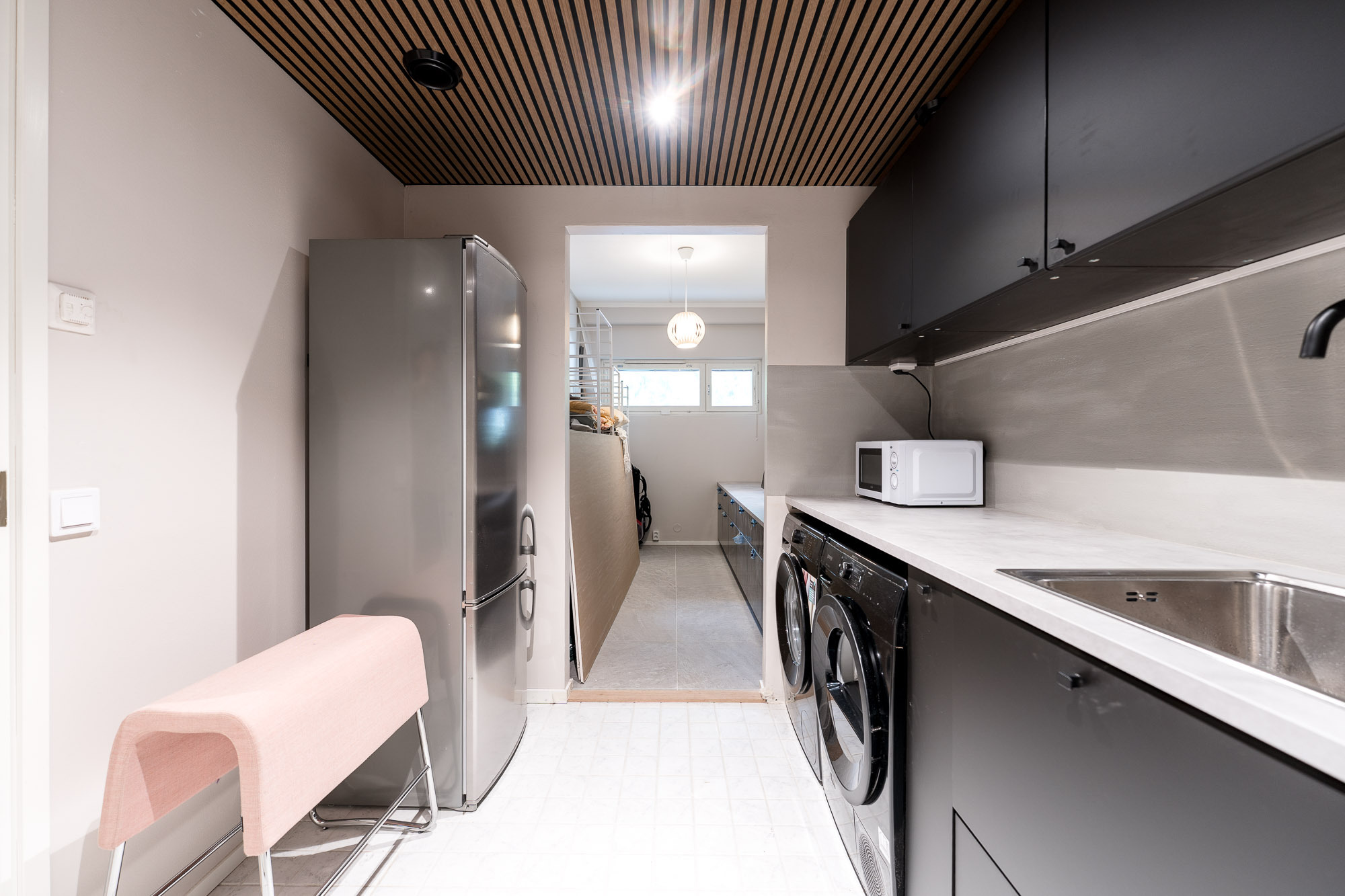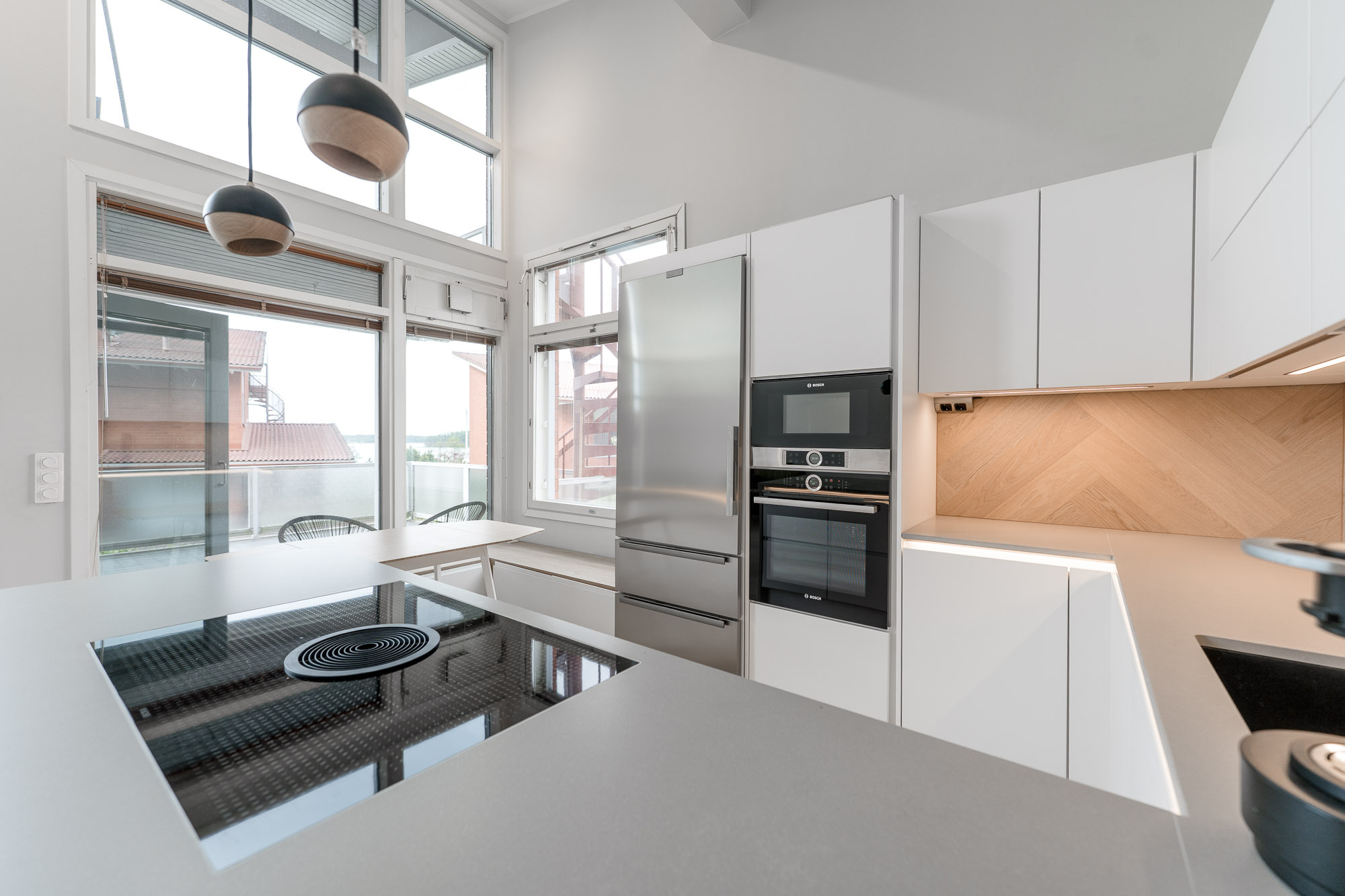 Keraaminen liesi, liesituuletin integroitu lieteen (suodatin), Festivon kylmäjärjestelmä, erillinen kalusteuuni, kalustemikroaaltouuni, integroitu astianpeskukone, viinikaappi integroitu oh:n puolelle seinään, ikkunapenkki, Noblessa keittiö moottorisoituine osineen ja integroituine valoineen, komposiittikivitasot, lattia kalanruotoparketti, välitila kalanruotoparketti, seinät ja katto maalattu.