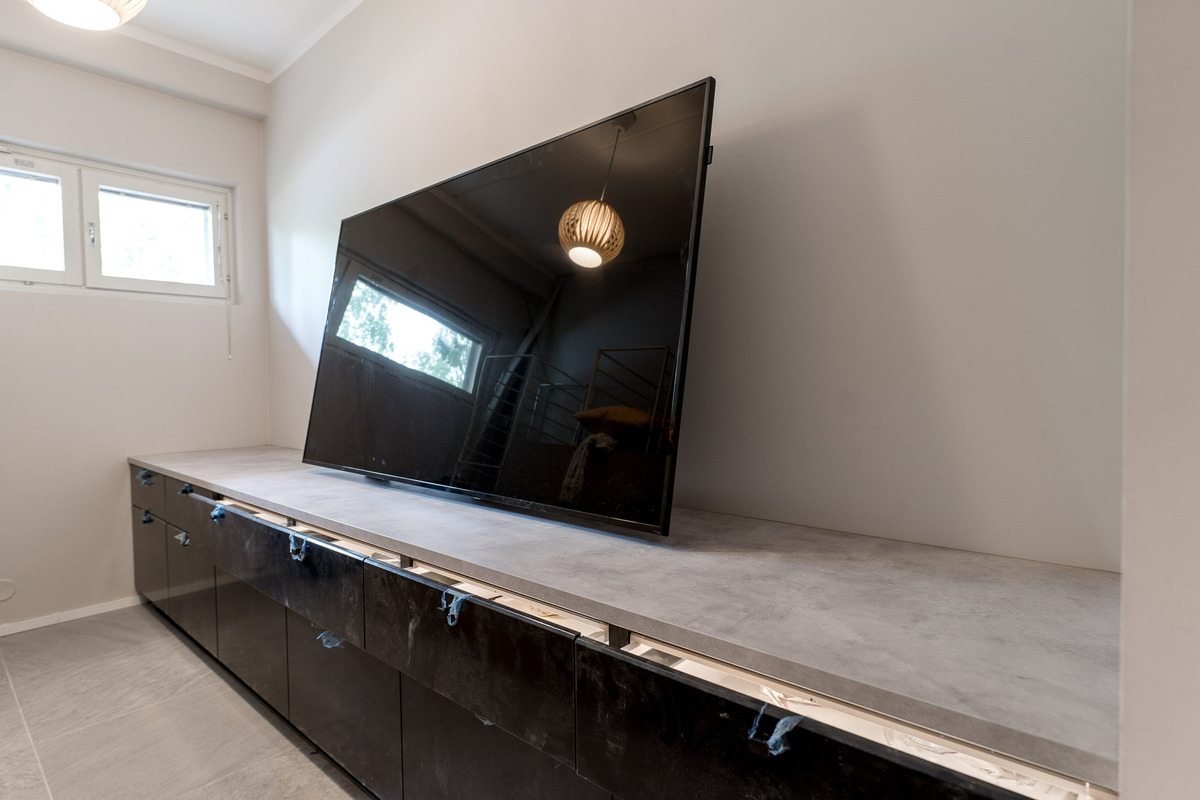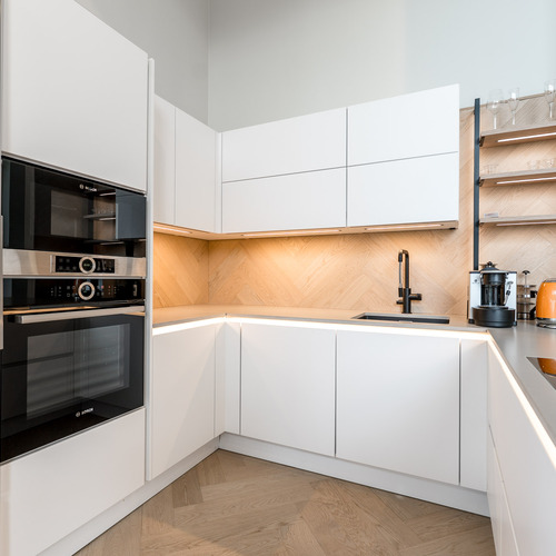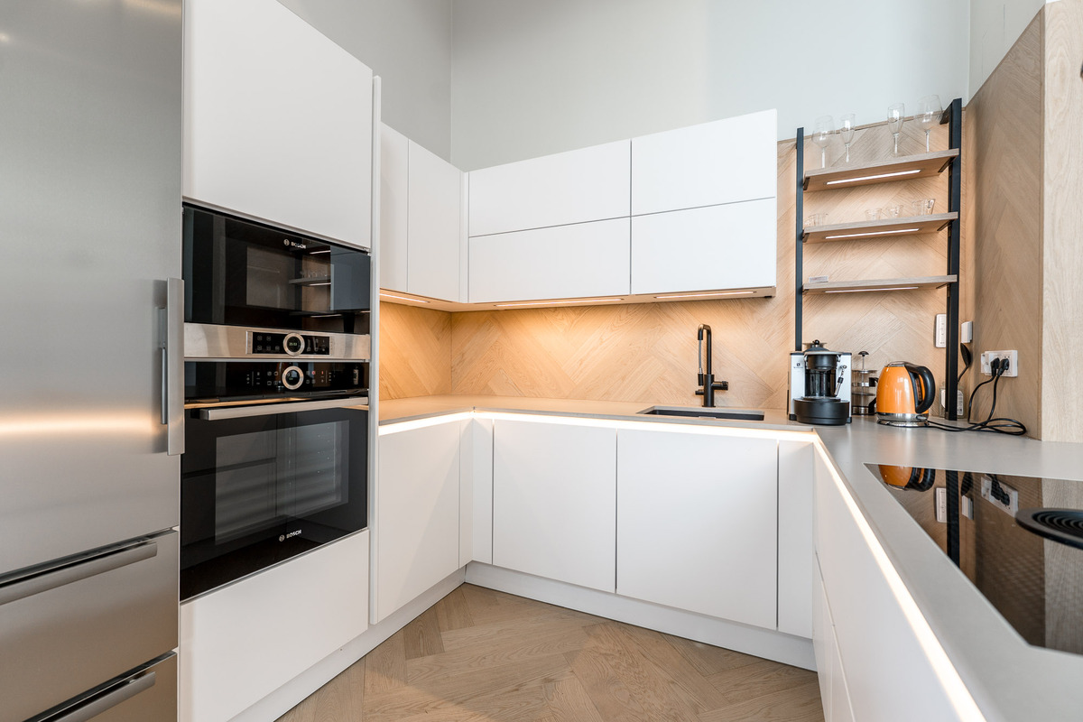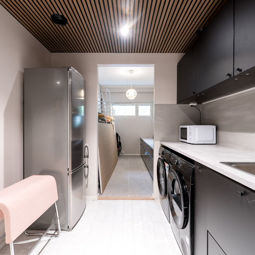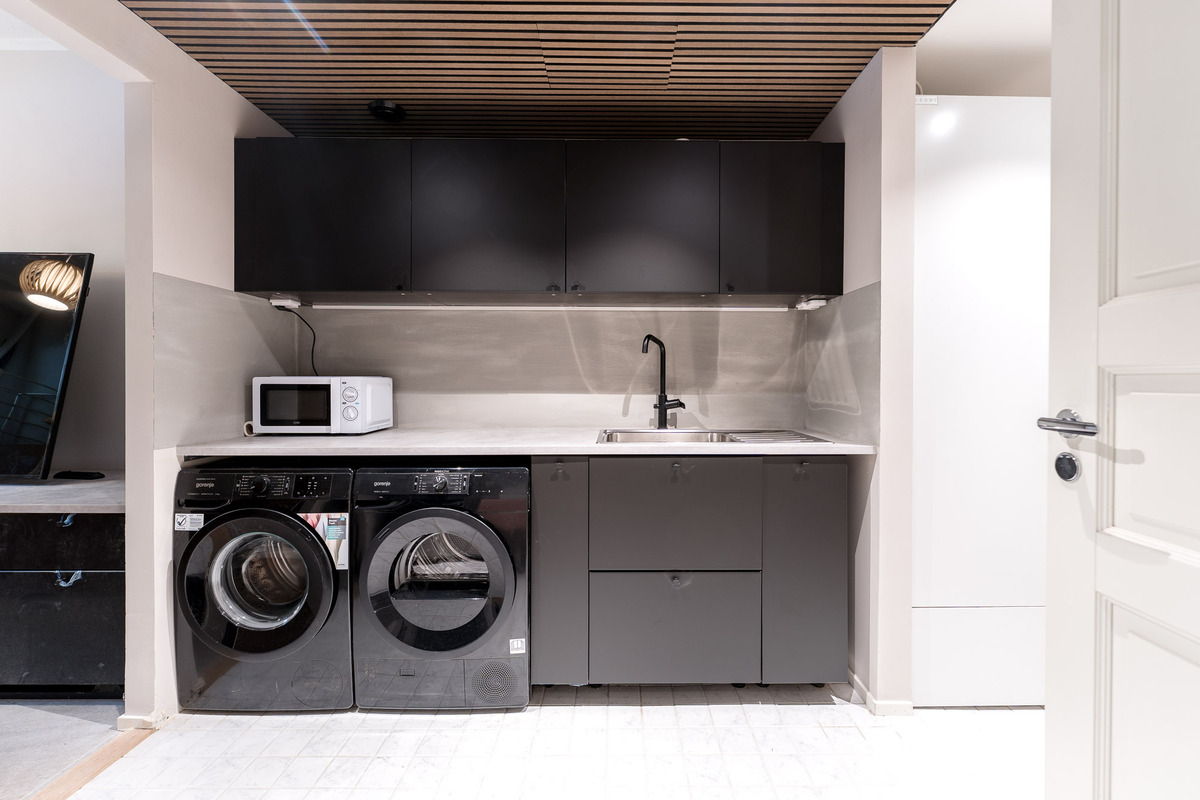 Keraaminen liesi, liesituuletin integroitu lieteen (suodatin), Festivon kylmäjärjestelmä, erillinen kalusteuuni, kalustemikroaaltouuni, integroitu astianpeskukone, viinikaappi integroitu oh:n puolelle seinään, ikkunapenkki, Noblessa keittiö moottorisoituine osineen ja integroituine valoineen, komposiittikivitasot, lattia kalanruotoparketti, välitila kalanruotoparketti, seinät ja katto maalattu.