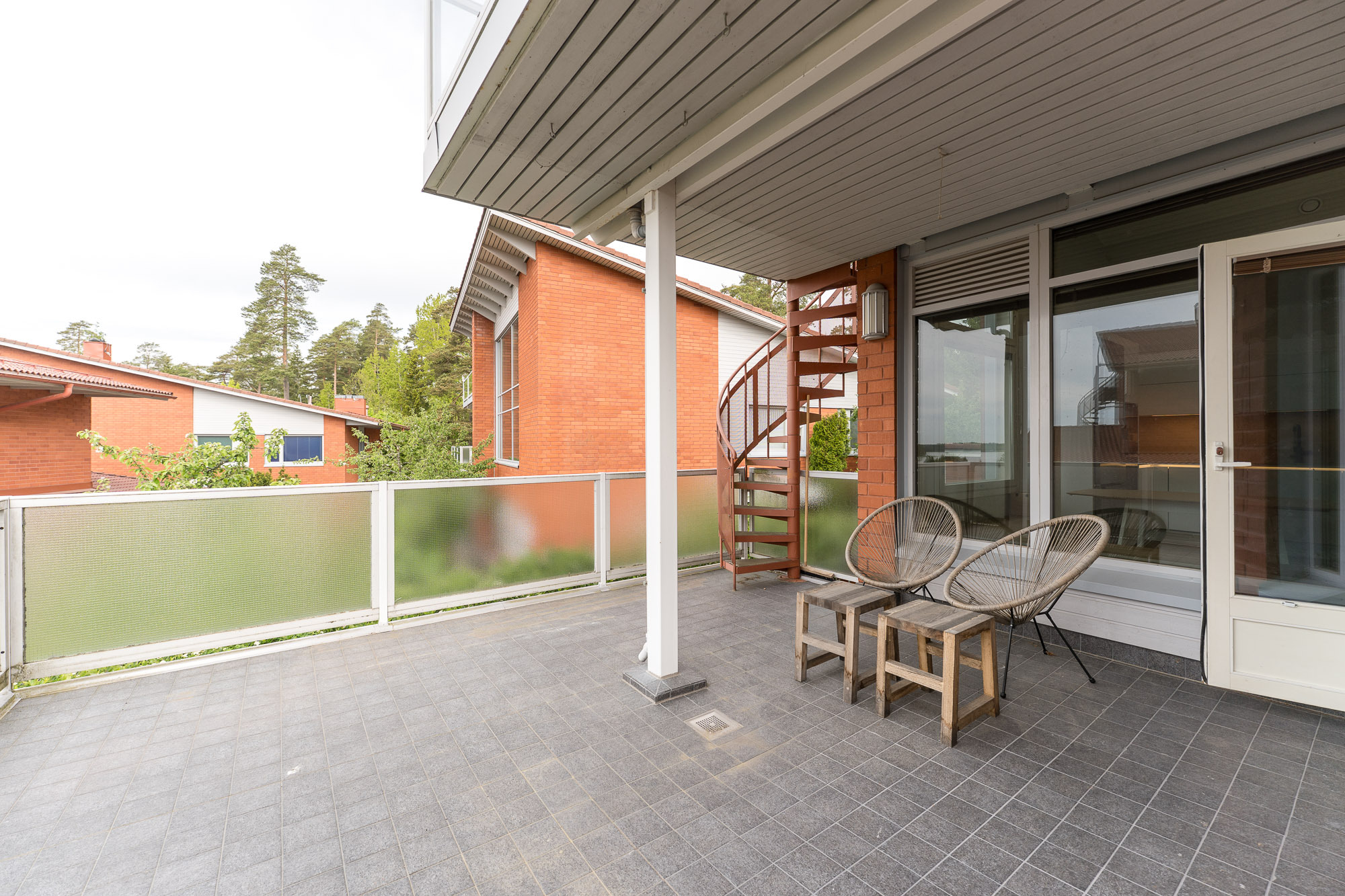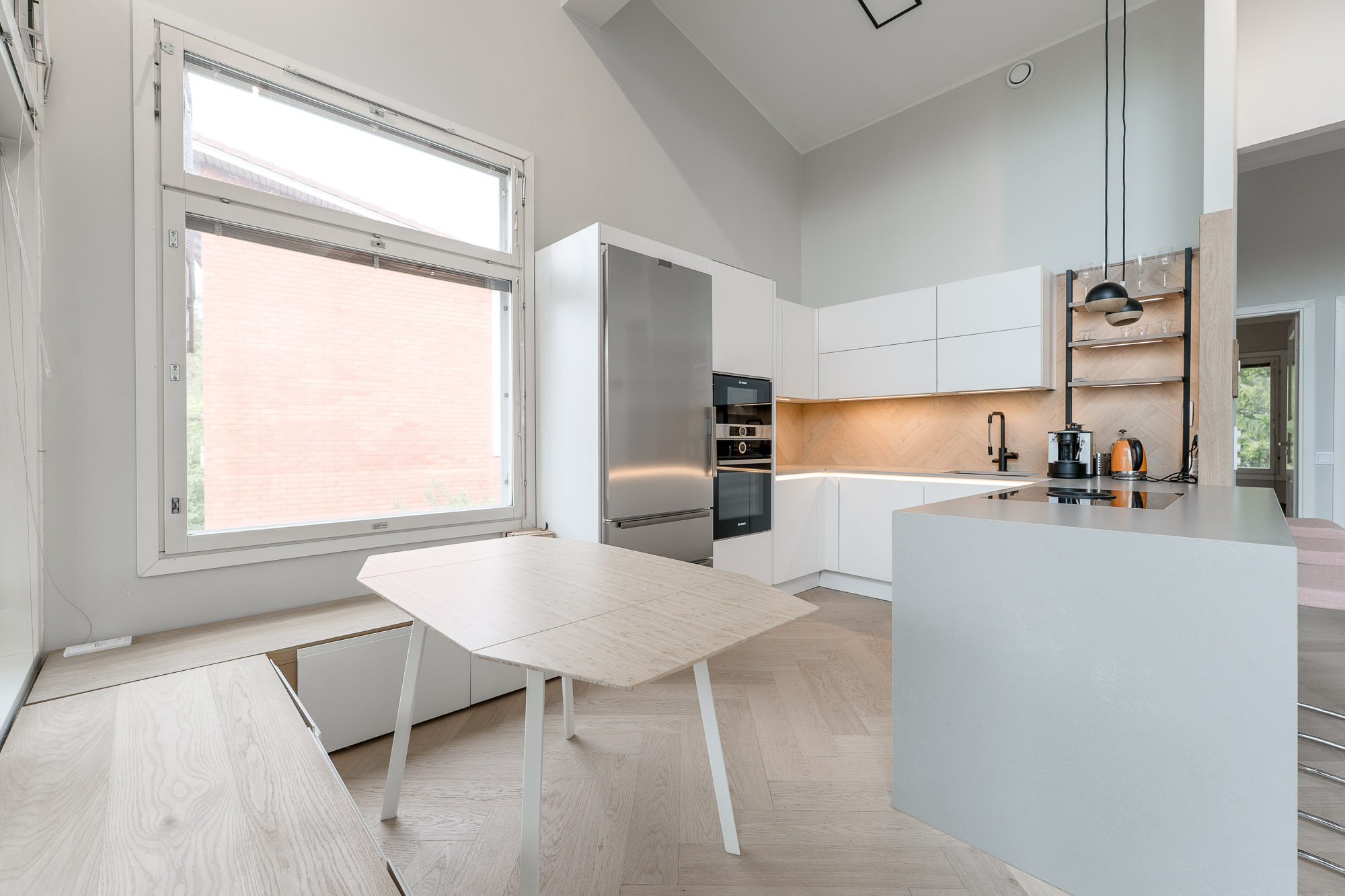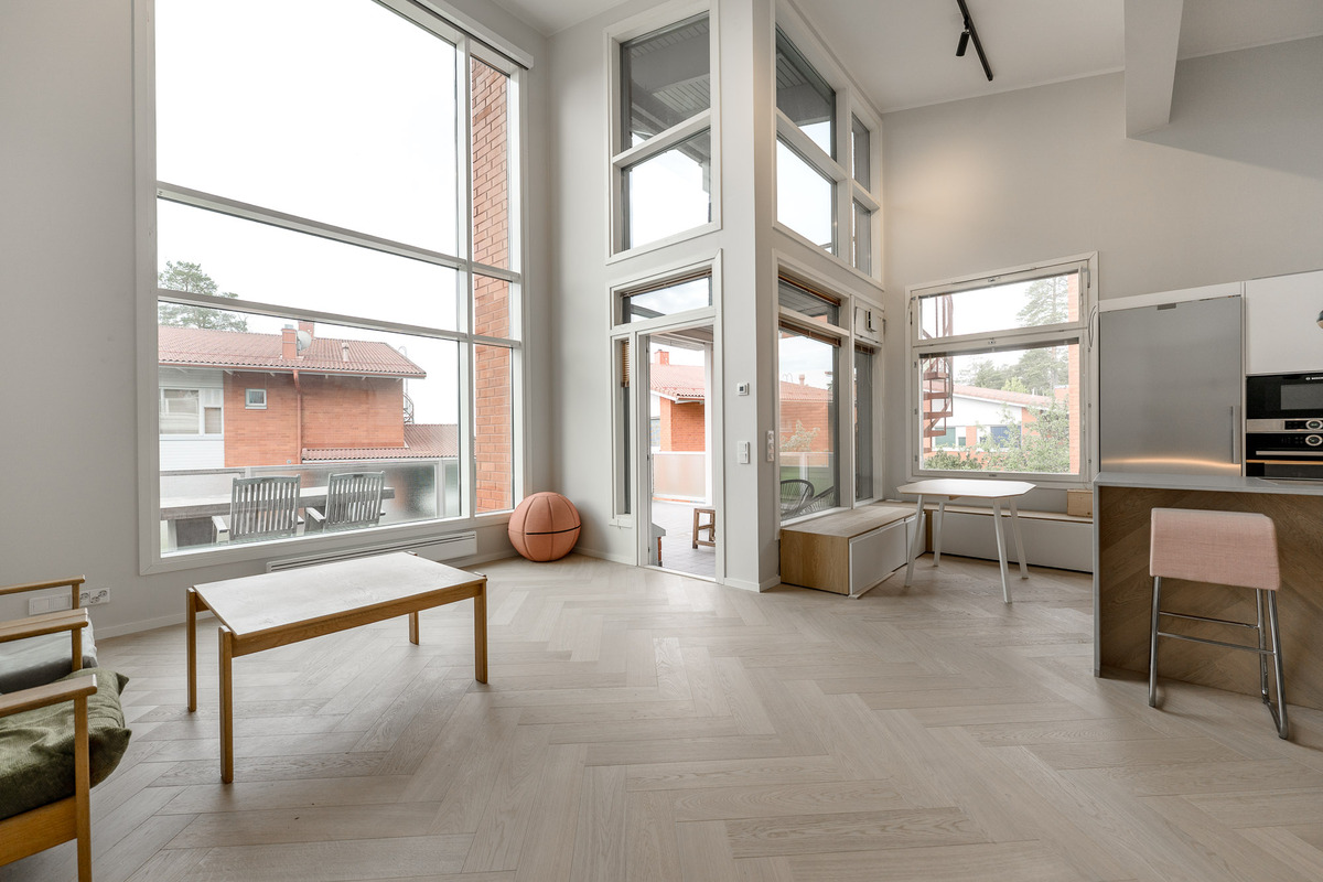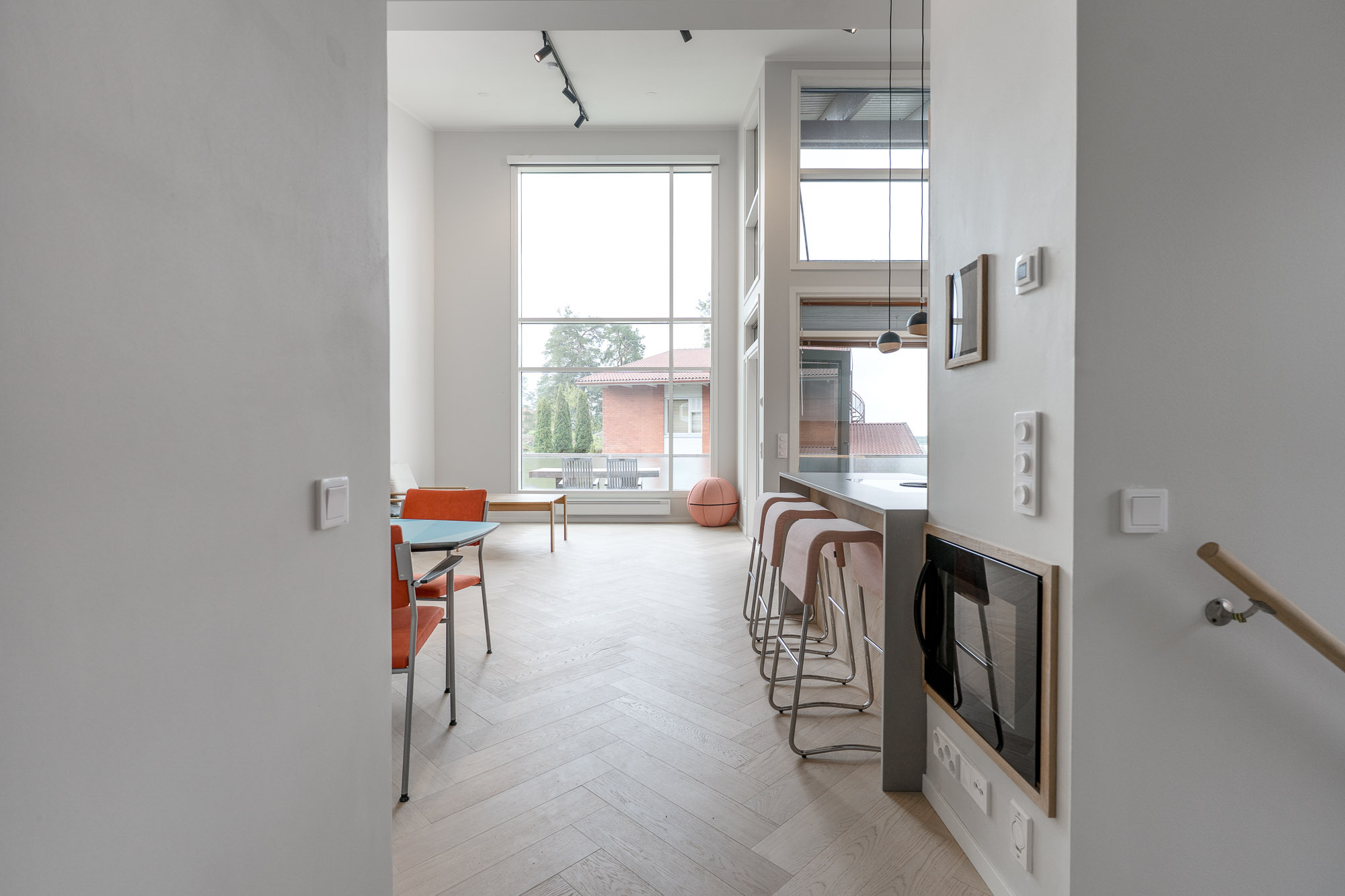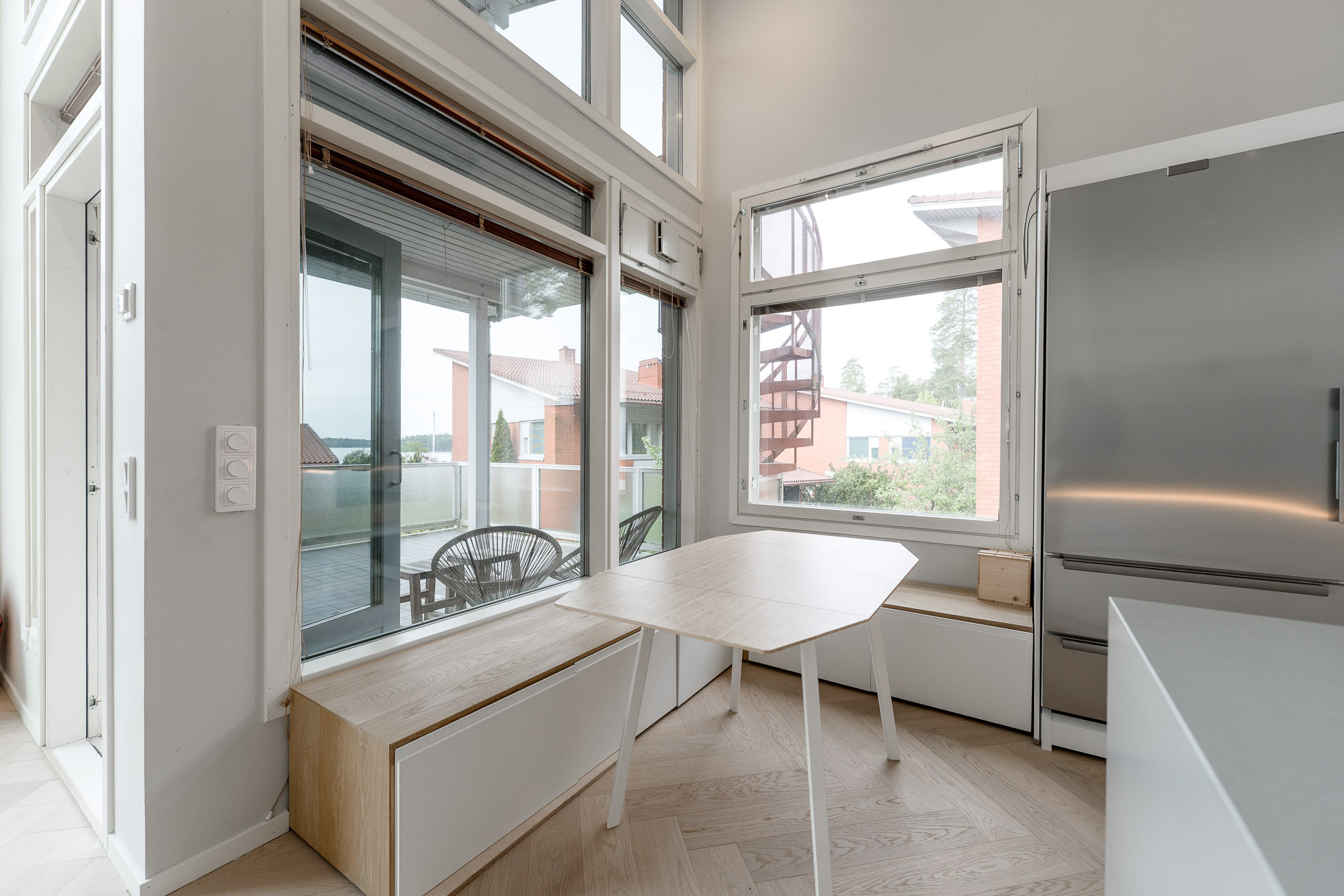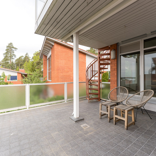 Tämä juuri täysin uusittu koti edustaa ajatonta eleganssia kalanruotoparketeillaan ja korkeilla valovirroin täyttyvillä tiloillaan. Olohuoneen vaikuttava korkea vinokatto ja suuret ikkunat luovat ainutlaatuisen tunnelman, jota täydentää varaava takka lämpimien iltojen viettoon. Terassilta ja parvekkeelta avautuvat merinäkymät tekevät jokaisesta hetkestä erityisen.