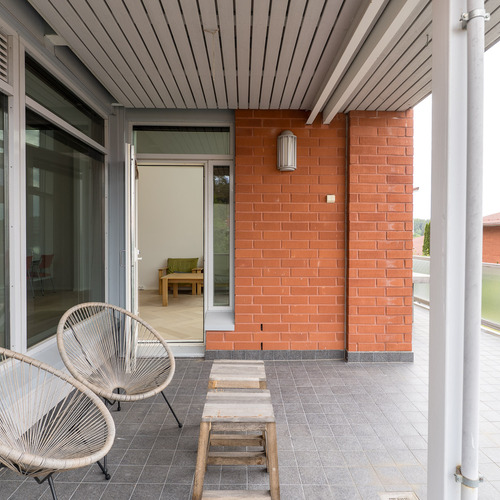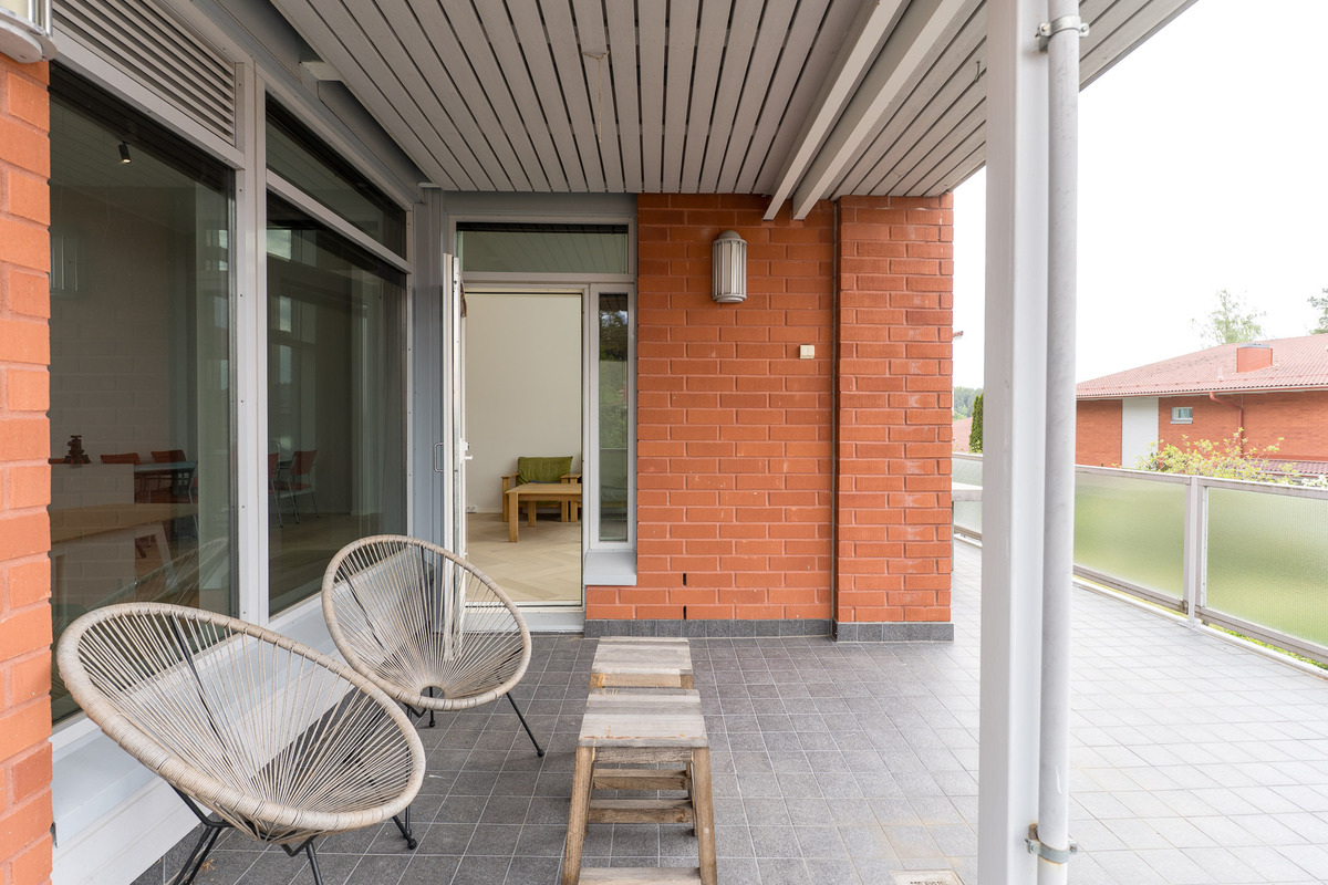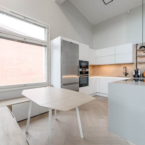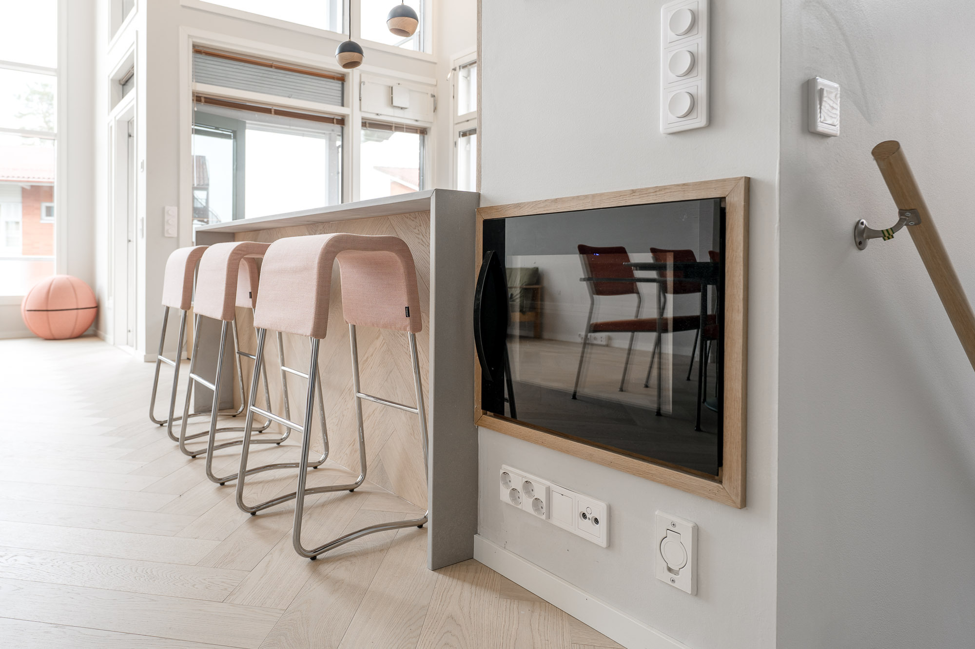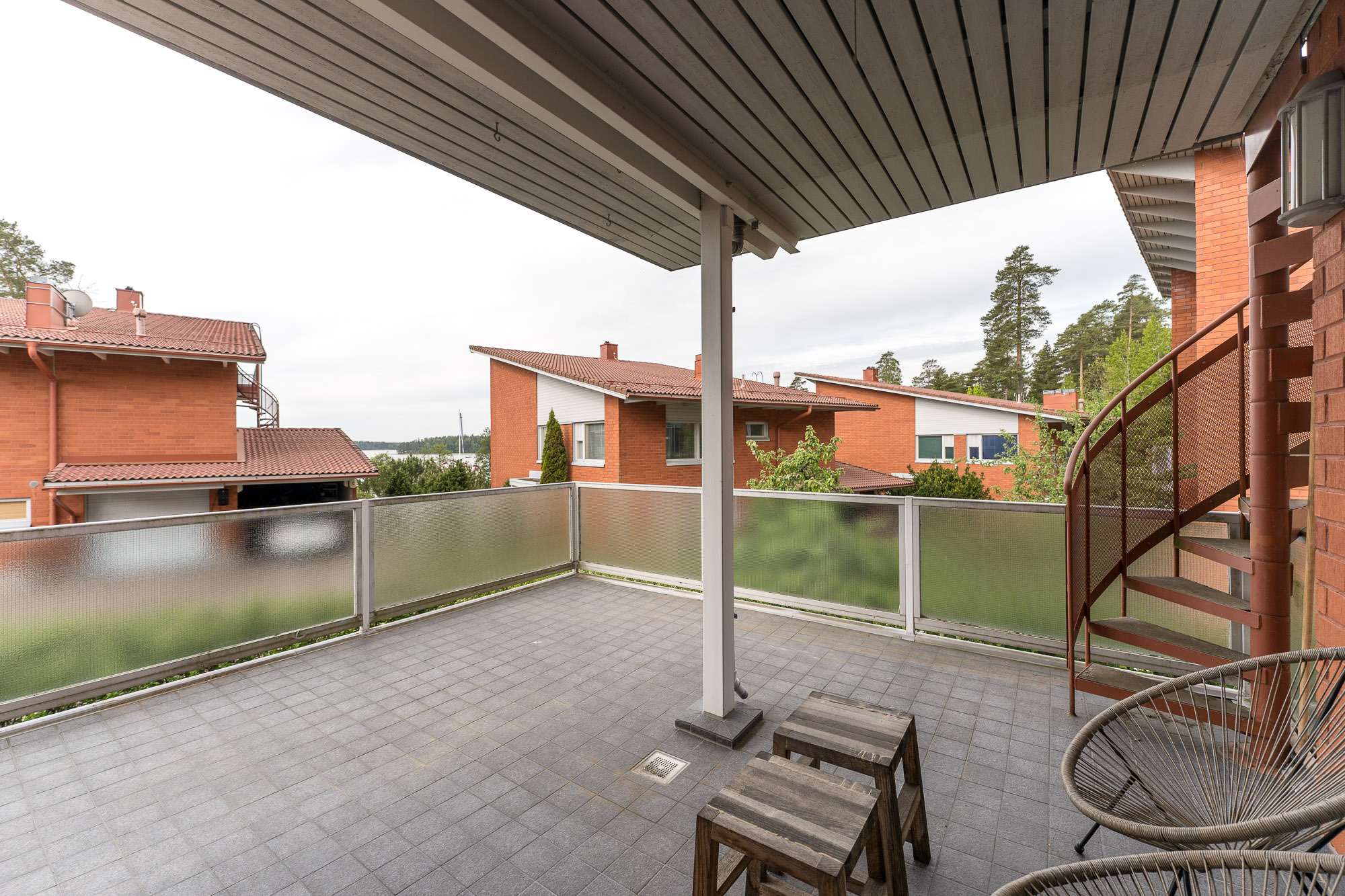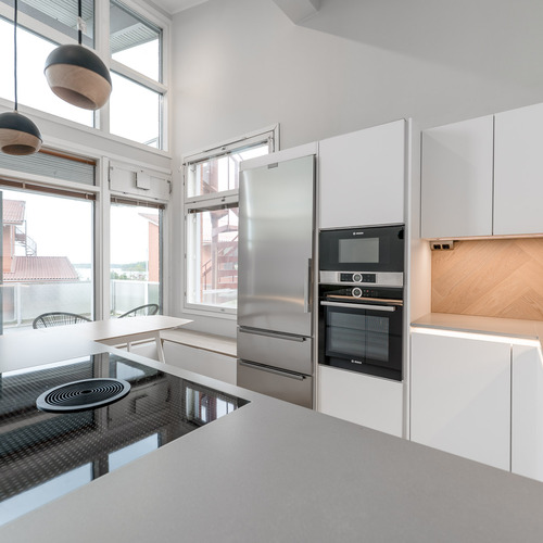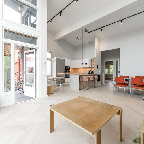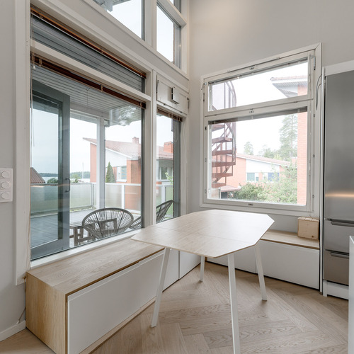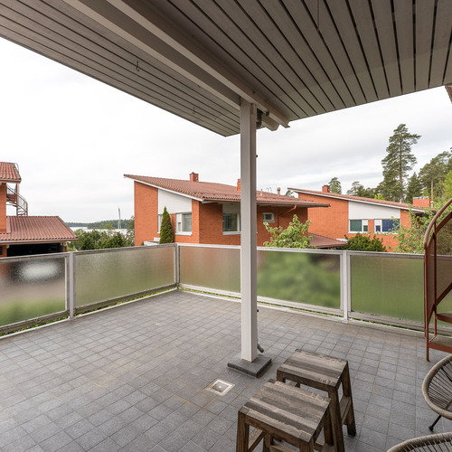 Tämä juuri täysin uusittu koti edustaa ajatonta eleganssia kalanruotoparketeillaan ja korkeilla valovirroin täyttyvillä tiloillaan. Olohuoneen vaikuttava korkea vinokatto ja suuret ikkunat luovat ainutlaatuisen tunnelman, jota täydentää varaava takka lämpimien iltojen viettoon. Terassilta ja parvekkeelta avautuvat merinäkymät tekevät jokaisesta hetkestä erityisen.